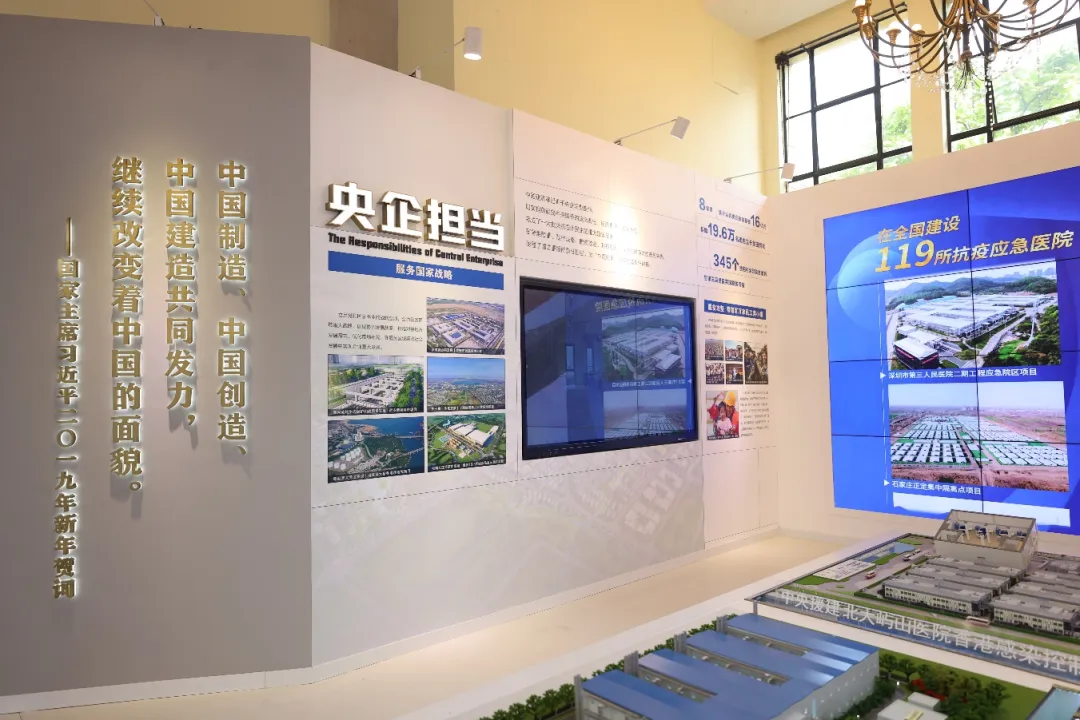 包括火神山医院、雷神山医院、负压病房模型、北大屿山医院香港感染控制中心模型以及“中国建筑 建证战疫”专题片,综合利用多媒体、数字化展陈技术,发挥“屏幕、模型、沙盘”协同互动效应,从多重维度深刻展现中国建筑将深入贯彻习近平总书记重要讲话和重要指示批示精神作为首要政治任务,践行人民至上、生命至上理念,在国内奋力建成以火神山、雷神山医院为代表的119所应急医院,特别承建中央援建香港的社区治疗设施及临时医院,展现“听党召唤、不畏艰险、团结奋斗、使命必达”的精神和力量;在全球与利益相关方携手同行、共克时艰,传递拓展幸福空间的“中建温度”。
