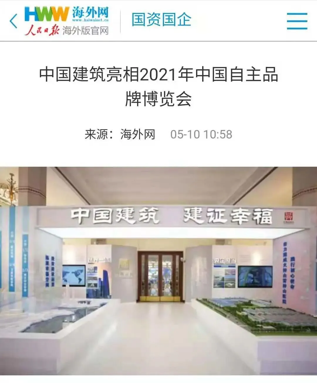 5月10日,2021年中国自主品牌博览会在上海展览中心盛大开幕,中国建筑“建证百年 同心筑梦”之 “发展筑行 接续奋斗征程”开放日第3场在中国建筑品牌展厅同时开启,展期三天。博览会是2021年“中国品牌日”的重要内容,中国建筑作为受邀参展的中央企业之一,在中央企业展区设置展位,有力展现集团高举习近平新时代中国特色社会主义思想伟大旗帜、聚焦“一创五强”战略目标,践行初心使命、彰显央企担当、迈向世界一流的“中国建造之路”,向广大受众讲述“中国建筑 建证幸福”的品牌故事。