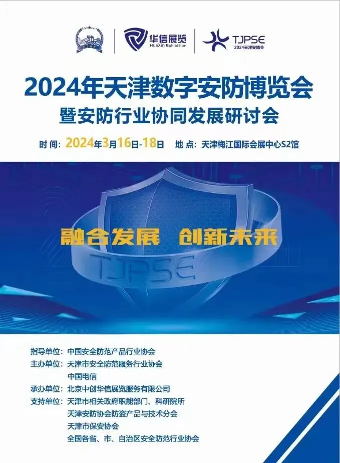 2024年3月16日,由中国安全防范产品行业协会指导,天津市安全防范服务行业协会、中国电信集团有限公司天津分公司联合主办,天津市相关政府职能部门、科研院所,全国各省、市、自治区安全防范行业协会、天津市保安协会、天津市应急产业联盟、天津安防协会防盗产品与技术分会支持,北京中创华信展览服务有限公司承办的“2024年数字安防(天津)博览会暨安防行业协同发展研讨会”将在天津梅江会展中心盛大开幕。