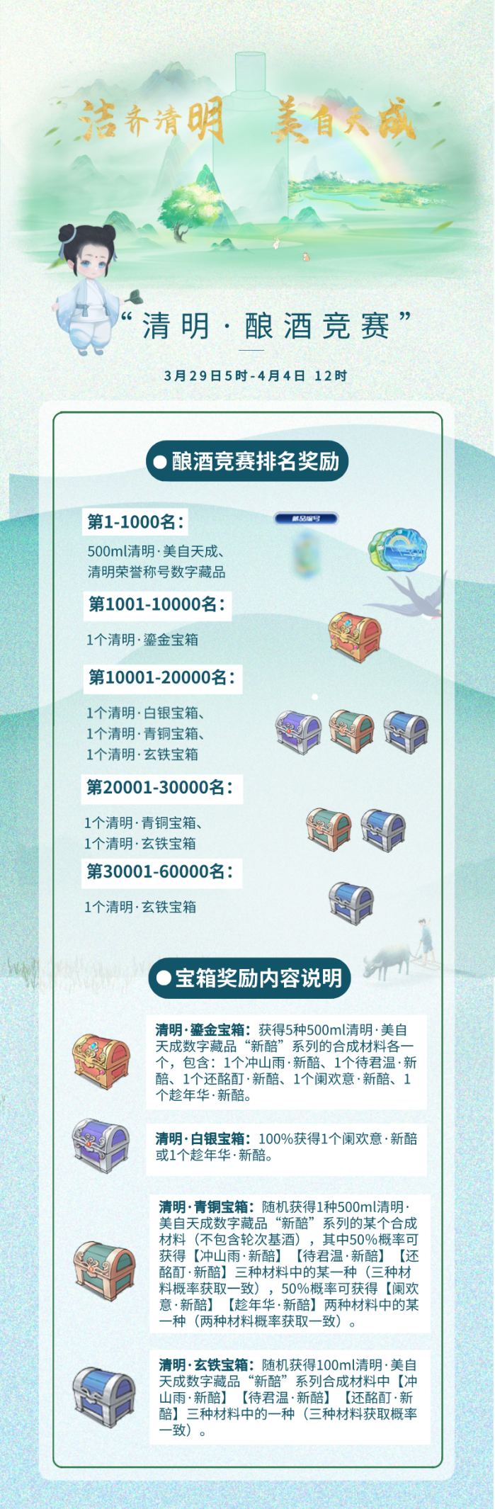 “清明·酿酒竞赛”中,酿造值排位前1000名的用户可获得合成版的“清明·美自天成”(新醅500ml)数字藏品一份,及对应的荣誉称号数字藏品一份。酿造值排位前6万名的用户,根据排名获得装有不同“新醅”系列合成材料的宝箱。具体规则小巽已经贴心准备好了,请查看了解吧!