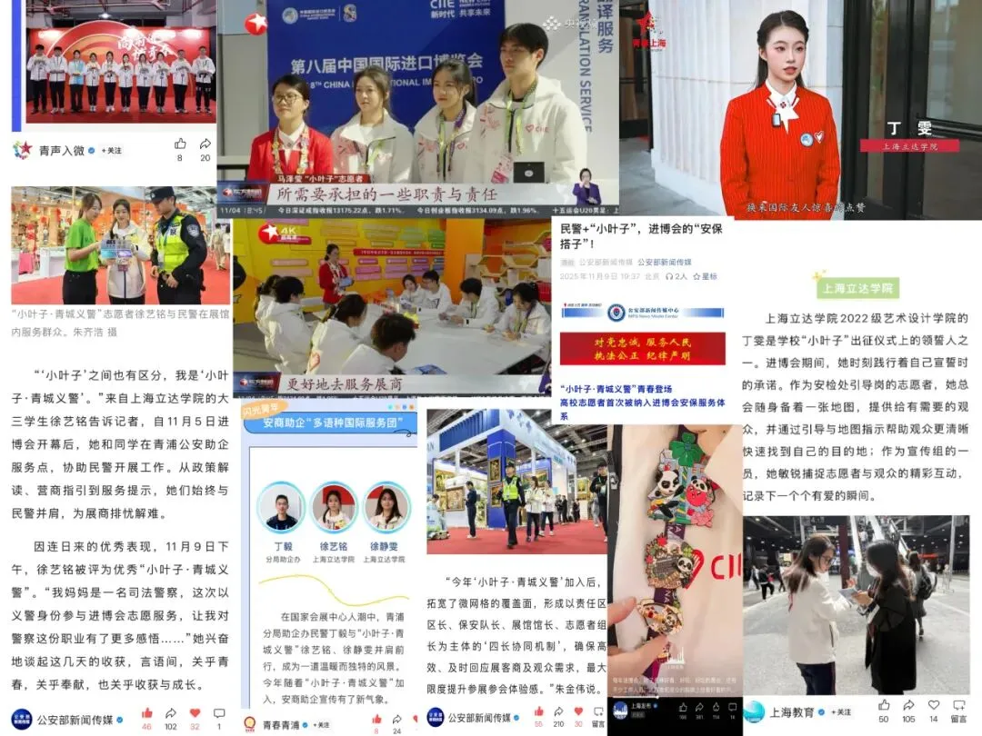 立达“小叶子”不仅是服务者,更是进博精神的传播者——无论是志愿者的个人风采,还是团队的暖心事迹,都多次受到主流媒体的关注与报道。我校丁雯同学的志愿者故事登上了“上海教育”官方公众号平台,留下了专属于立达青年的榜样故事;我校徐艺铭、周宇同学荣获优秀“小叶子·青城义警”称号,其中徐艺铭同学凭借在服务中的亮眼表现,作为志愿者代表登上上海电视台,相关故事也被“公安部新闻传媒”等多家主流媒体报道。