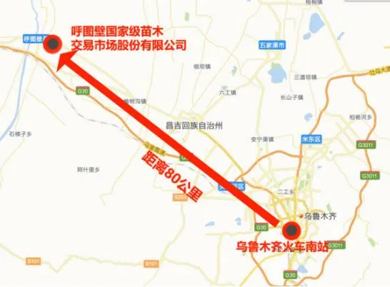 新疆呼图壁国家级苗木交易市场距离乌鲁木齐地窝堡国际机场70km