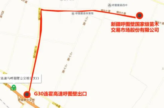 G30连霍高速呼图壁入口至呼图壁国家级苗木交易市场股份有限公司距离示意图。