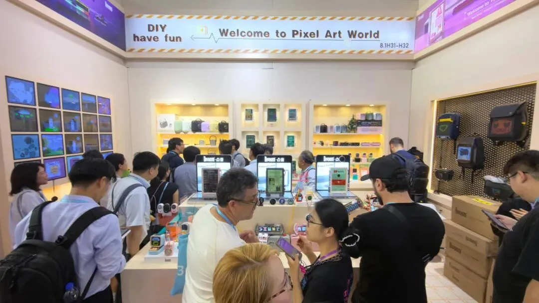 展会现场的互动热潮,正是点音创意社区活力的延伸。展台设置的“像素创作体验区”前,采购商与观众通过手机平板直接参与像素创作,即时生成的作品可同步到展品上展示。这种“即创即用”的模式,正是点音"用户共创"生态的缩影。