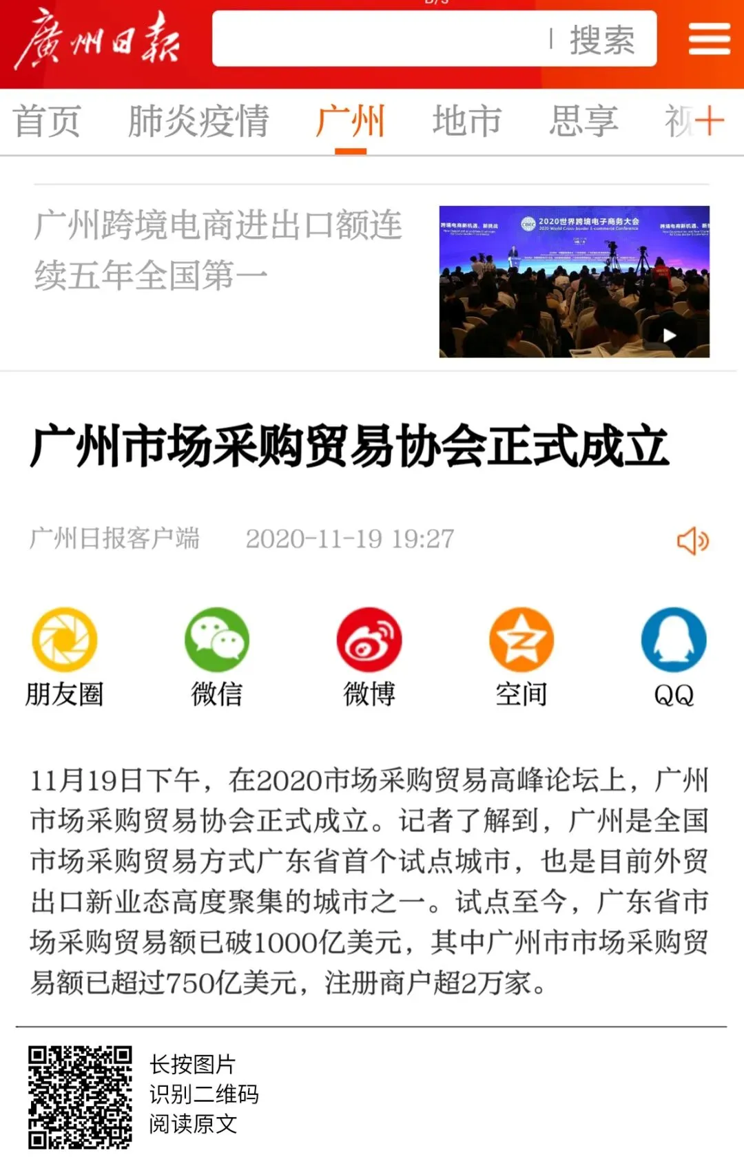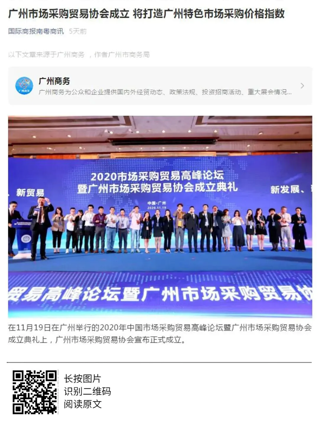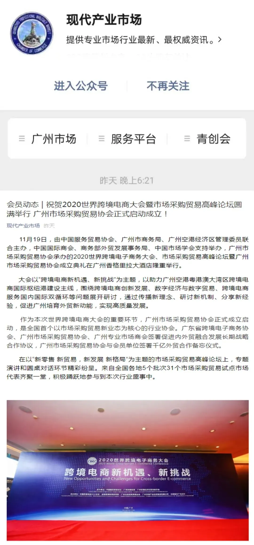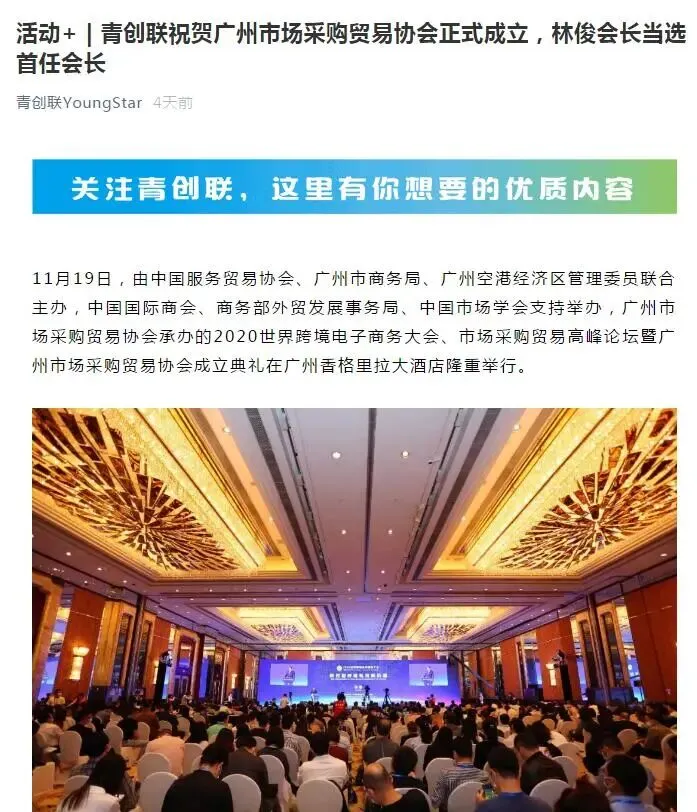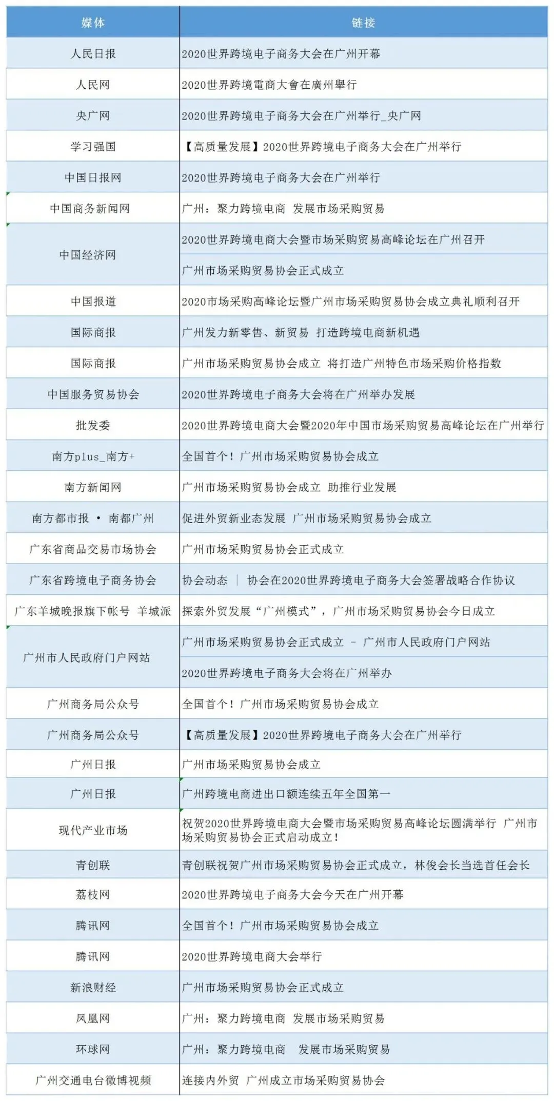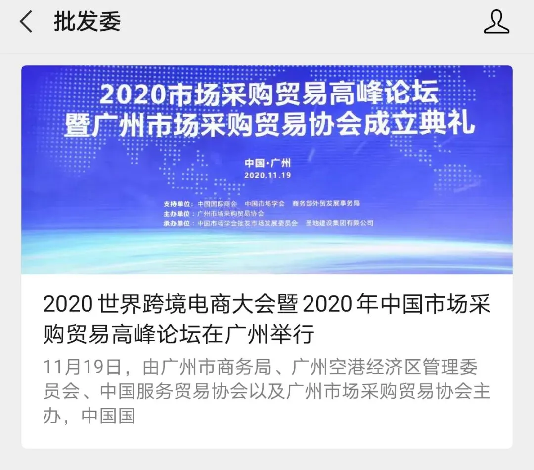 2020年世界跨境电商大会、市场采购贸易高峰论坛暨广州市场采购贸易协会成立典礼于11月19日圆满举办,当天活动吸引了人民日报、人民网、央广网、中国日报、中国商务新闻网、中国经济网等超50家中央、省、市主流媒体和自媒体平台,以图文、现场直播和短视频等形式进行全媒体多维度报道。形成了广泛的宣传效应,得到社会各界人士的共同关注。