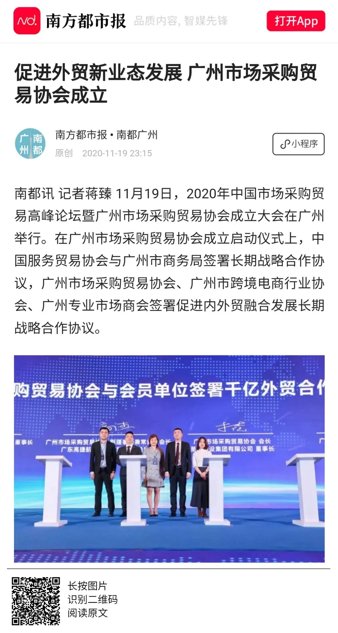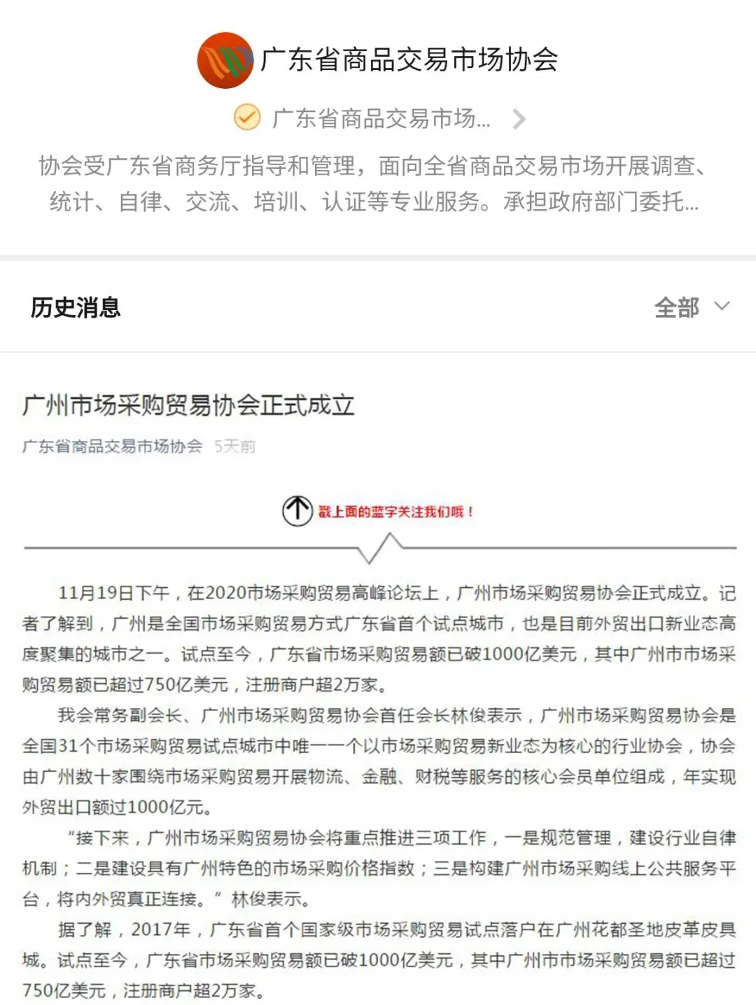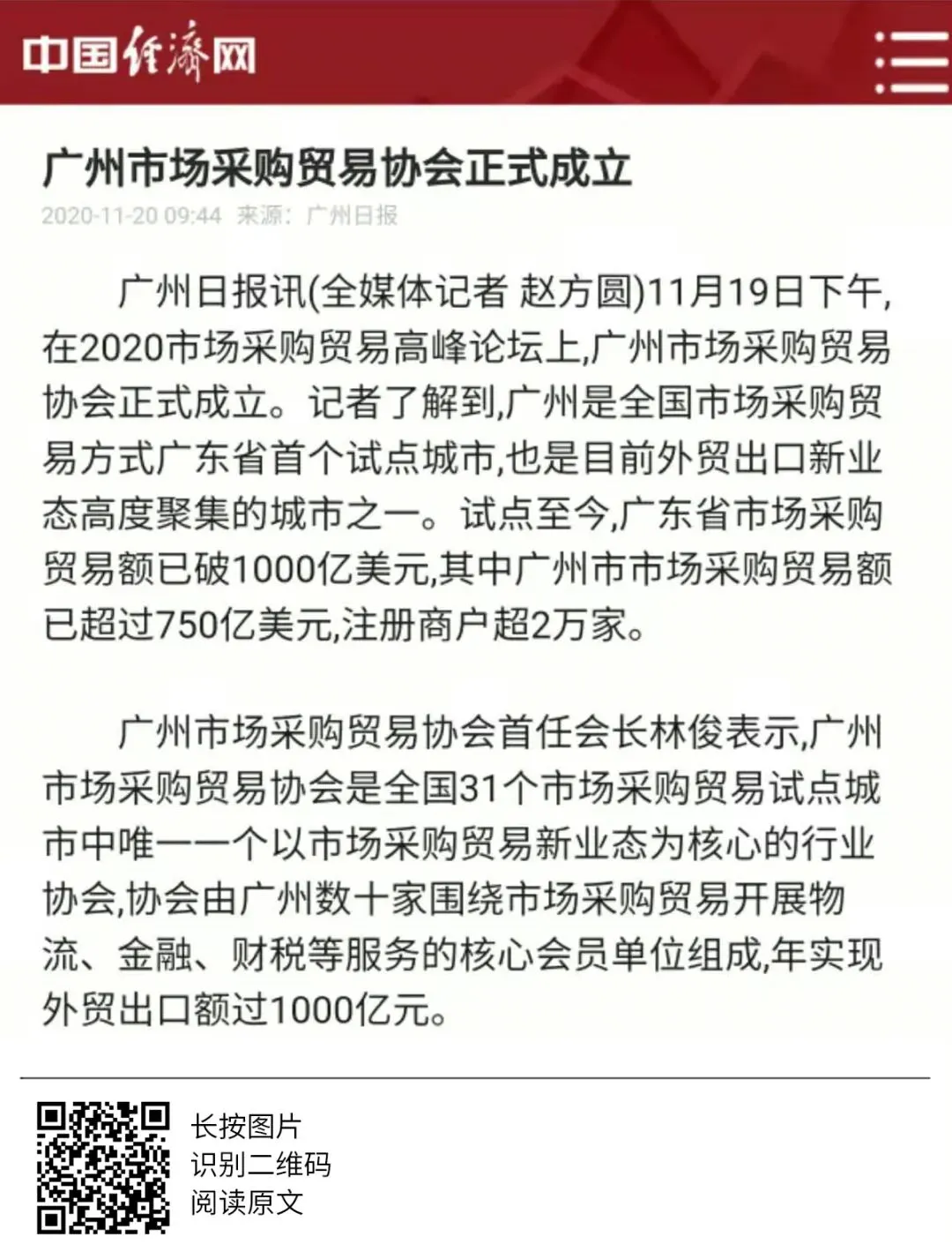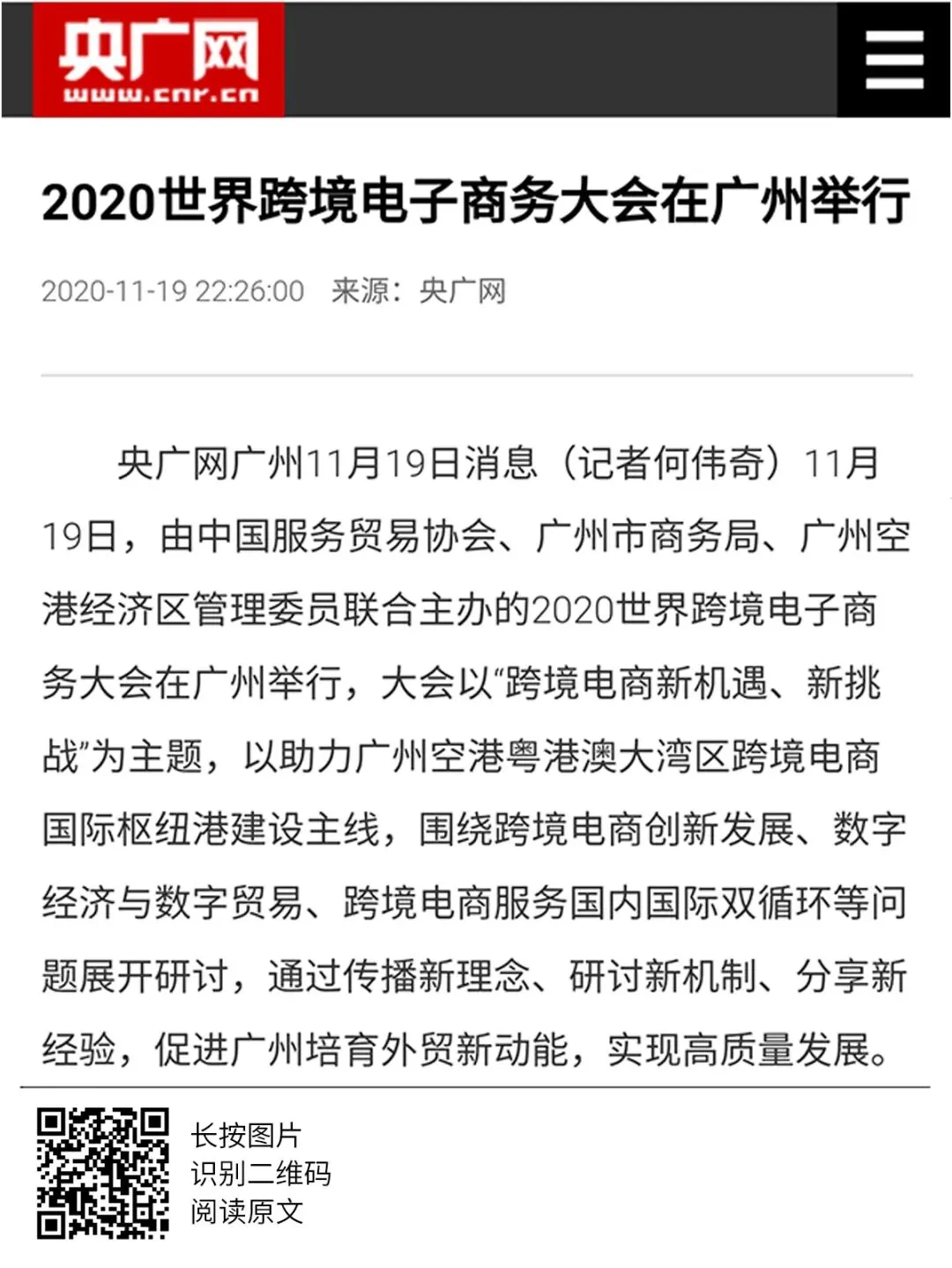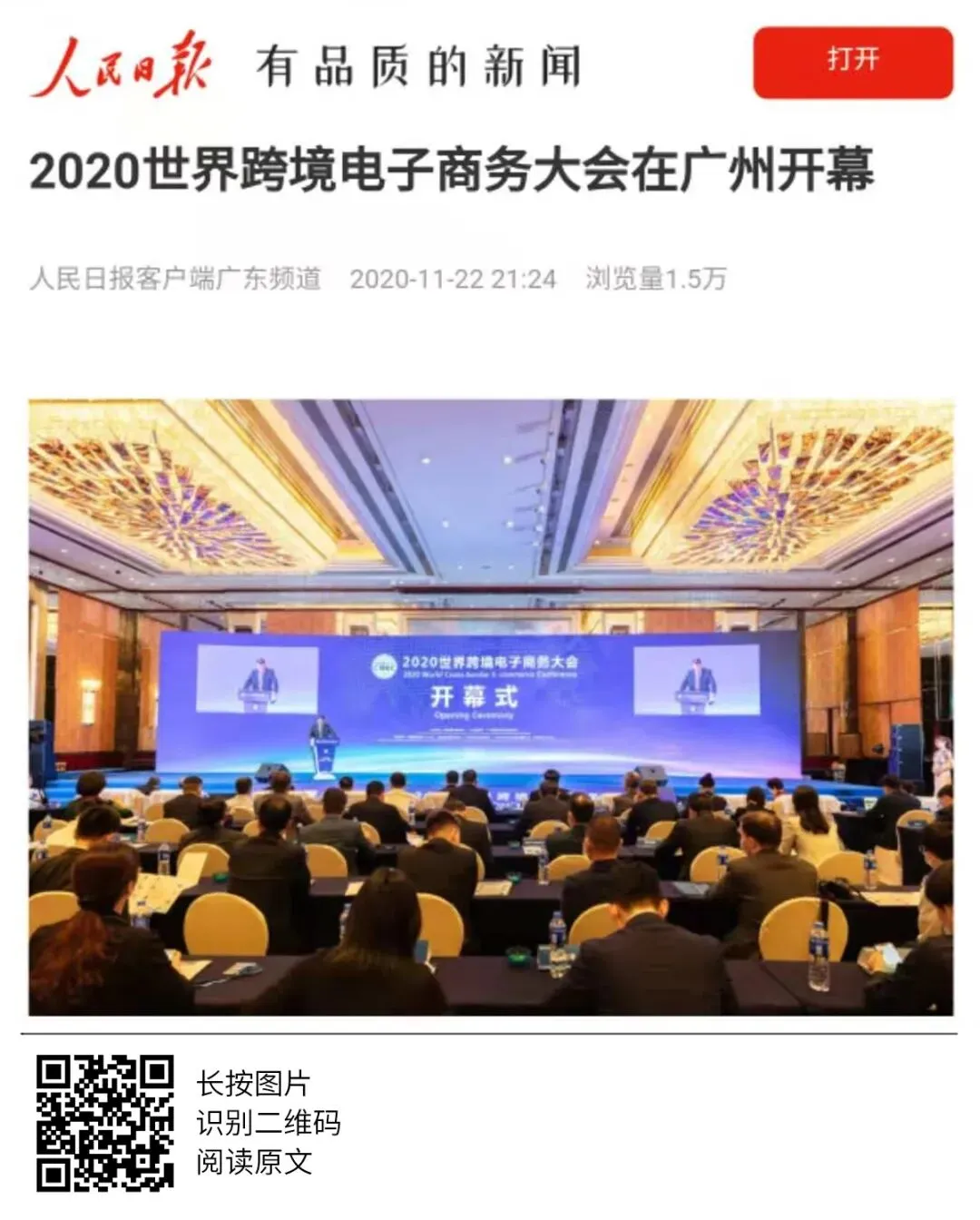 2020年世界跨境电商大会、市场采购贸易高峰论坛暨广州市场采购贸易协会成立典礼于11月19日圆满举办,当天活动吸引了人民日报、人民网、央广网、中国日报、中国商务新闻网、中国经济网等超50家中央、省、市主流媒体和自媒体平台,以图文、现场直播和短视频等形式进行全媒体多维度报道。形成了广泛的宣传效应,得到社会各界人士的共同关注。