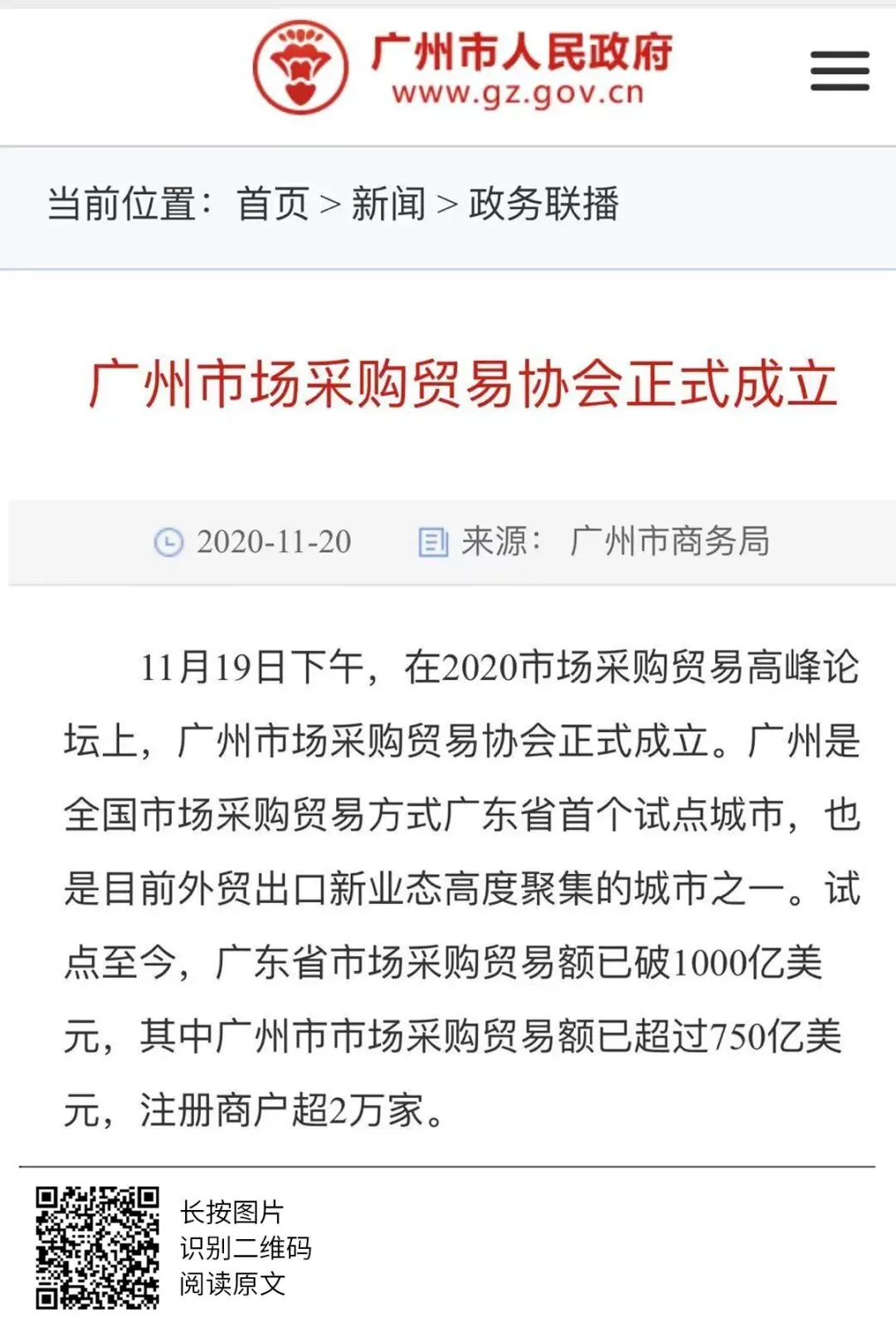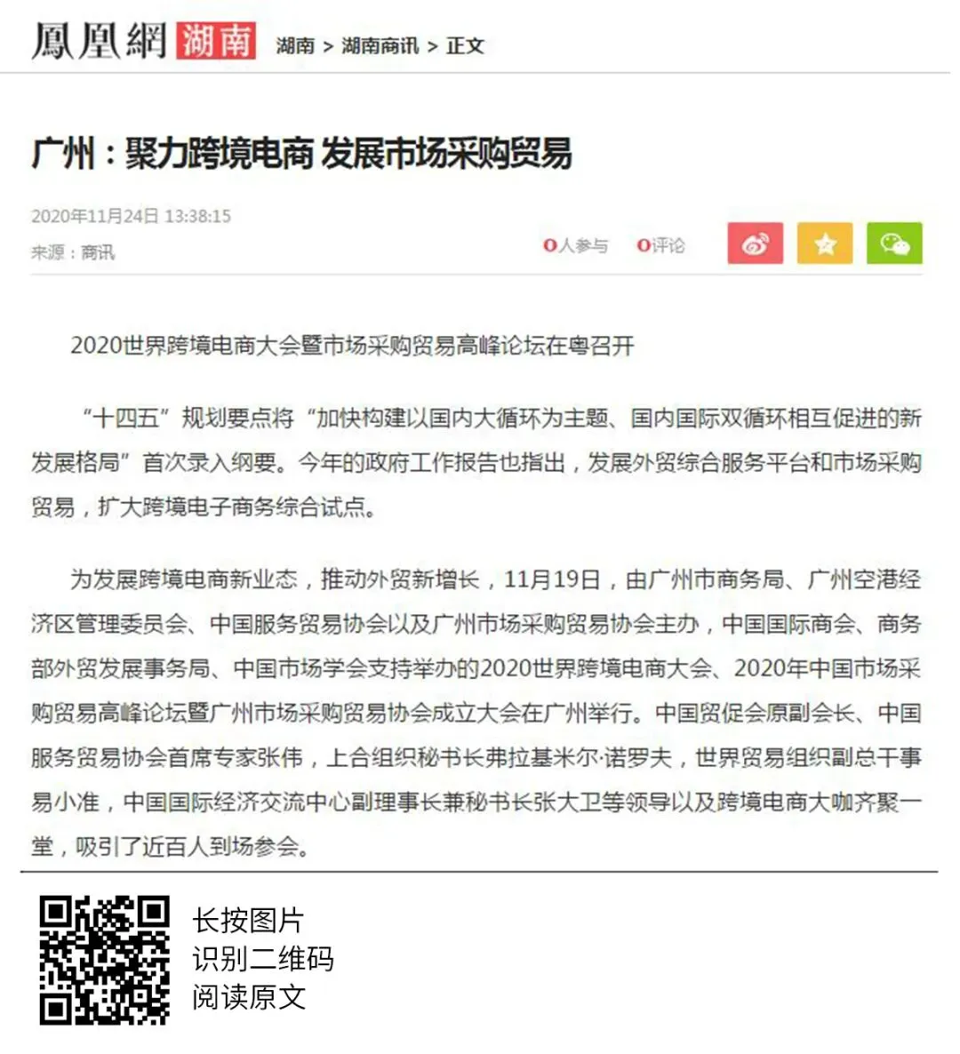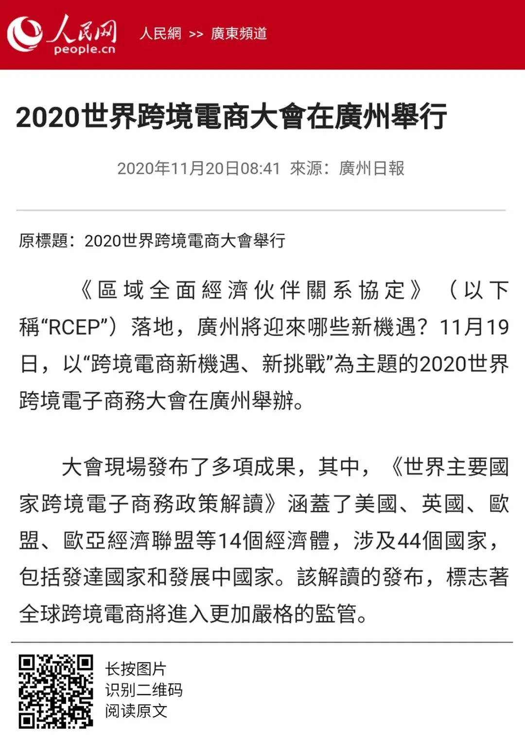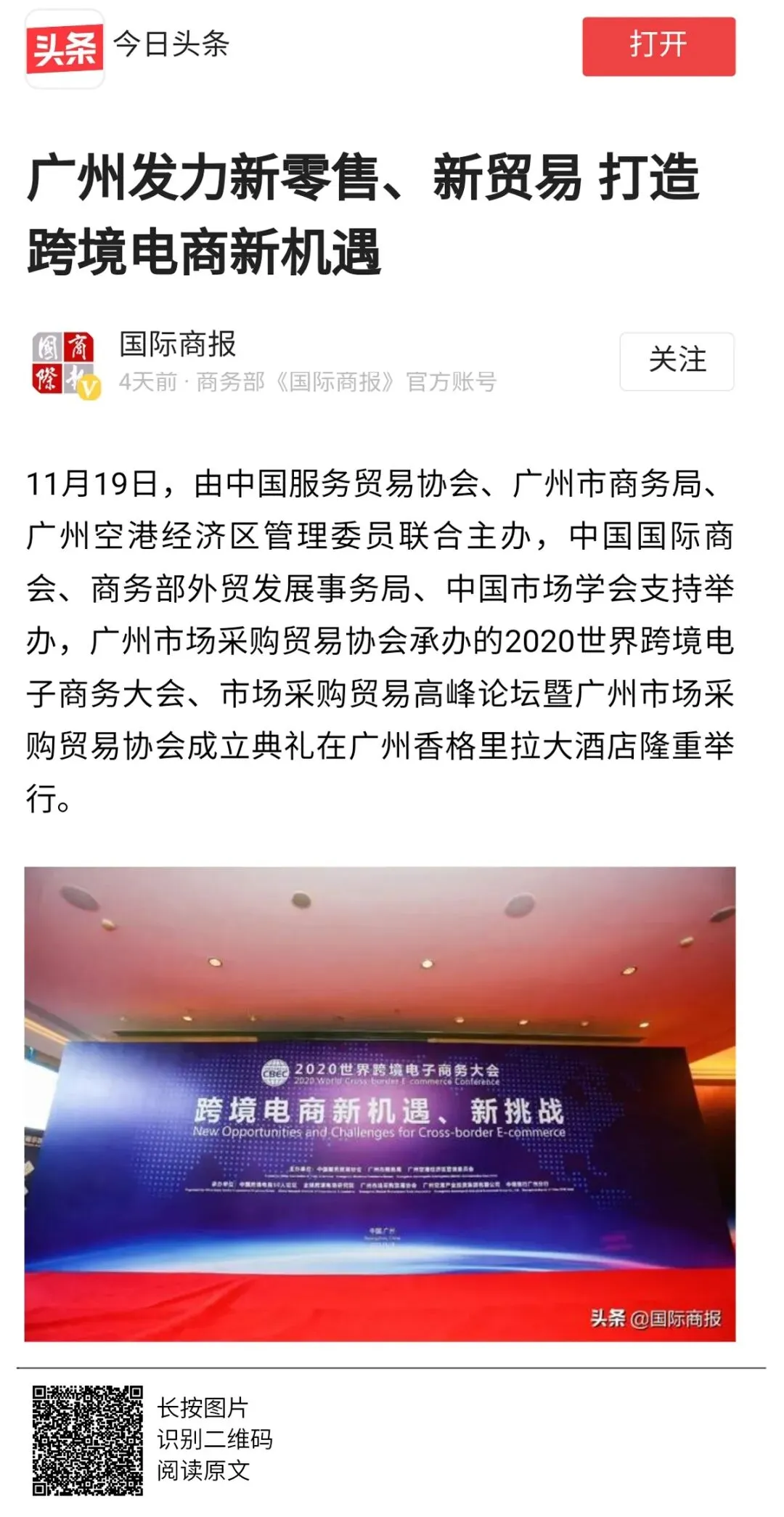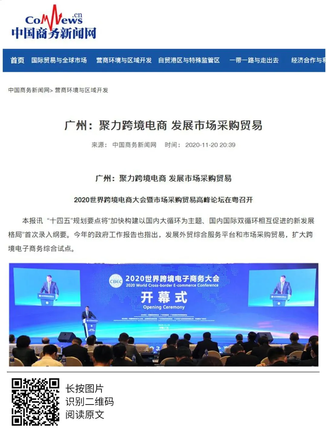 2020年世界跨境电商大会、市场采购贸易高峰论坛暨广州市场采购贸易协会成立典礼于11月19日圆满举办,当天活动吸引了人民日报、人民网、央广网、中国日报、中国商务新闻网、中国经济网等超50家中央、省、市主流媒体和自媒体平台,以图文、现场直播和短视频等形式进行全媒体多维度报道。形成了广泛的宣传效应,得到社会各界人士的共同关注。