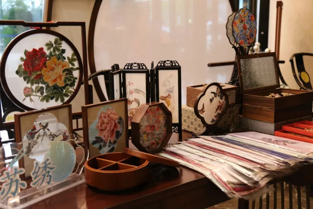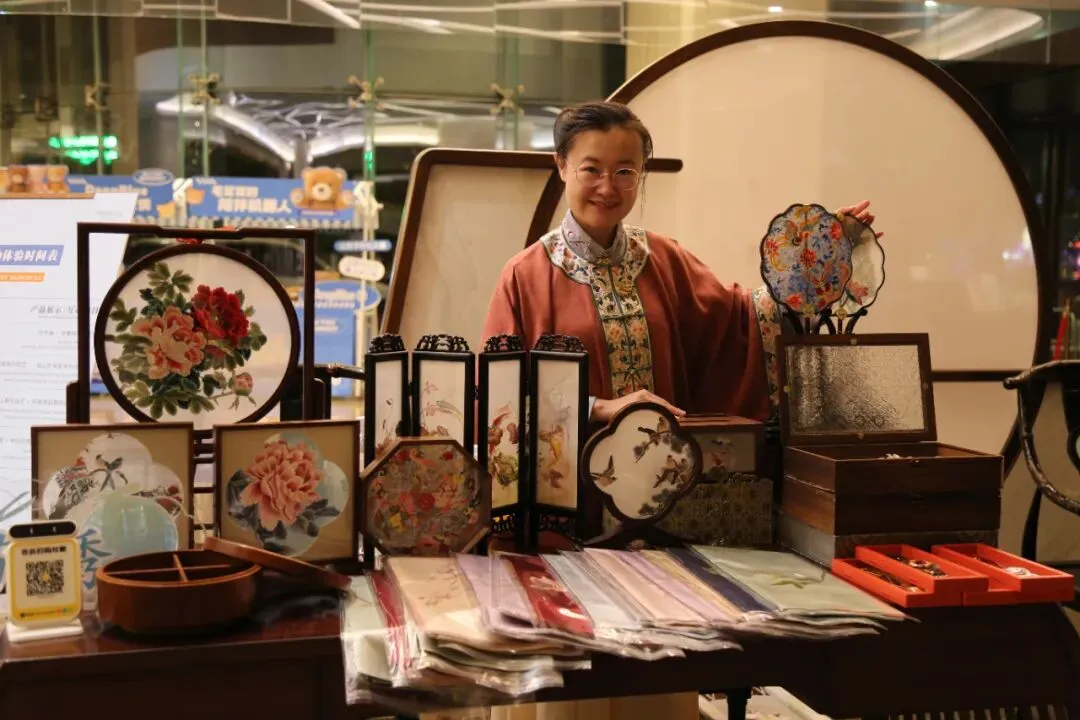 在各国记者下榻的酒店,一场“流动的江南美学”正在静默绽放。嘉定苏绣非遗代表性传承人阿紫携两百余件苏绣文创产品,将非遗技艺融入现代生活场景,为往来宾客织就一幅“针尖上的中国画卷”。