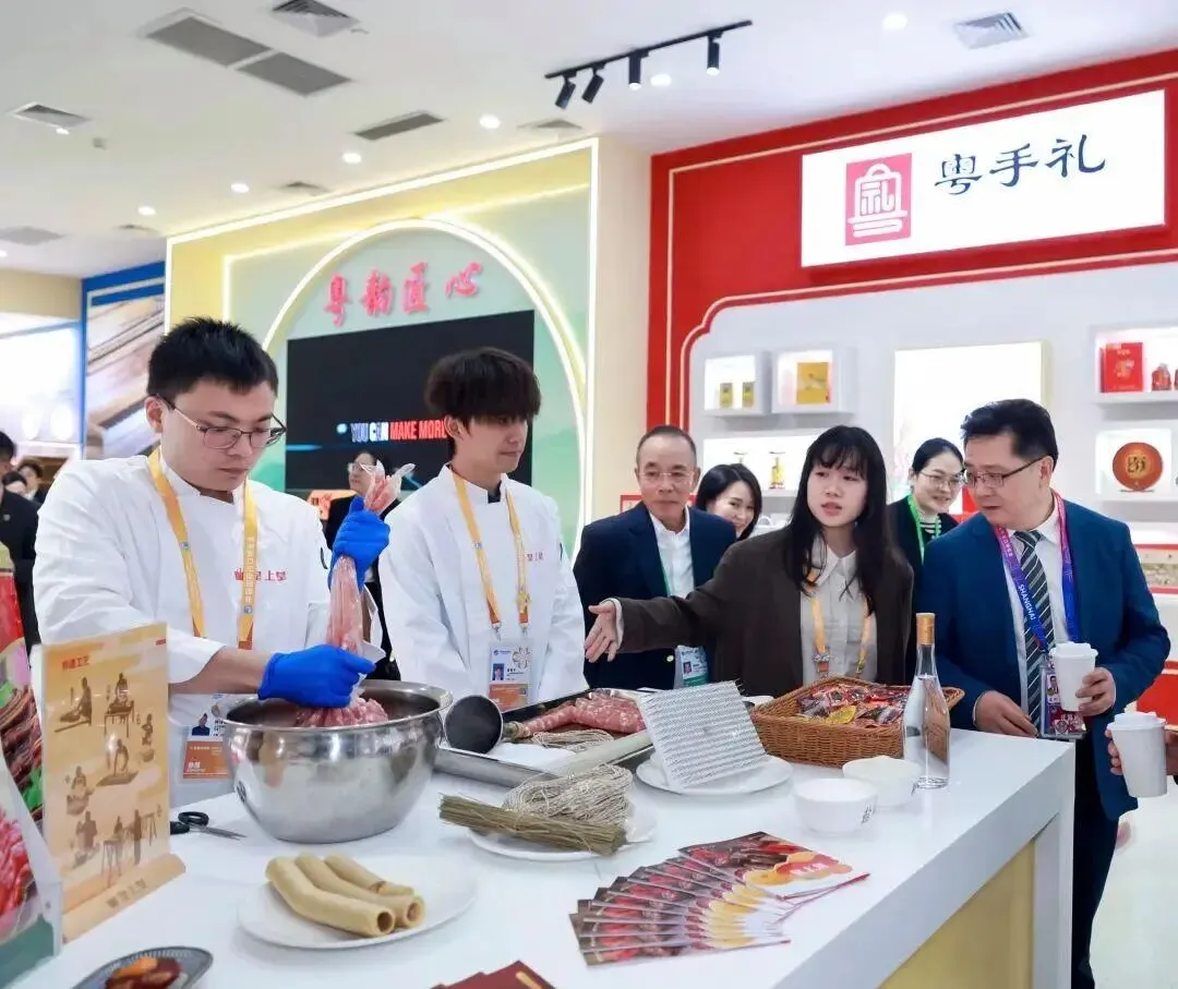 广东展团围绕“粤味传家”“粤匠承古”“粤养颐和”三大领域精心布局,集中展示了广式腊味、新会陈皮、裹蒸粽、龟苓膏、月饼等经典品类以及融合创新的特色产品。参展企业中,共有17项省级以上非遗技艺亮相进博,其中潘高寿的蜜炼川贝枇杷膏体熬制非遗技艺入选全国老字号创新发展大会技艺展示环节,广州酒家集团入选中华老字号守正创新十大案例。