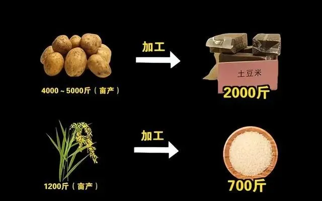 还有个关键点 , 土豆是全球第四大粮食作物 , 中国产量世界第一 , 一亩地能产5000斤土豆 , 换算成土豆米是2000斤 , 但水稻一亩才700斤大米。