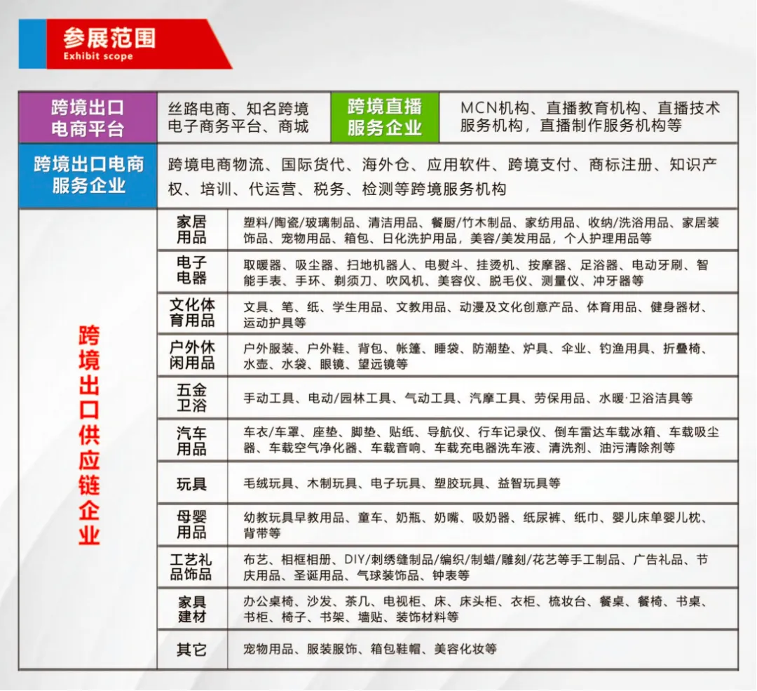 本届博览会以"构建新发展格局,发展高质量电商"为主题,规划国际标准展位2200个,展览面积超50000平方米,涵盖跨境电商、跨境电商服务、跨境直播服务、品牌供应链等核心展区。展会同期将举办2026电商嘉年华、2026电子商务高质量发展成果发布会、跨境电商出海生态大会等高端活动打造集展览展示、行业交流、商贸对接于一体的国际化跨境电商盛会。