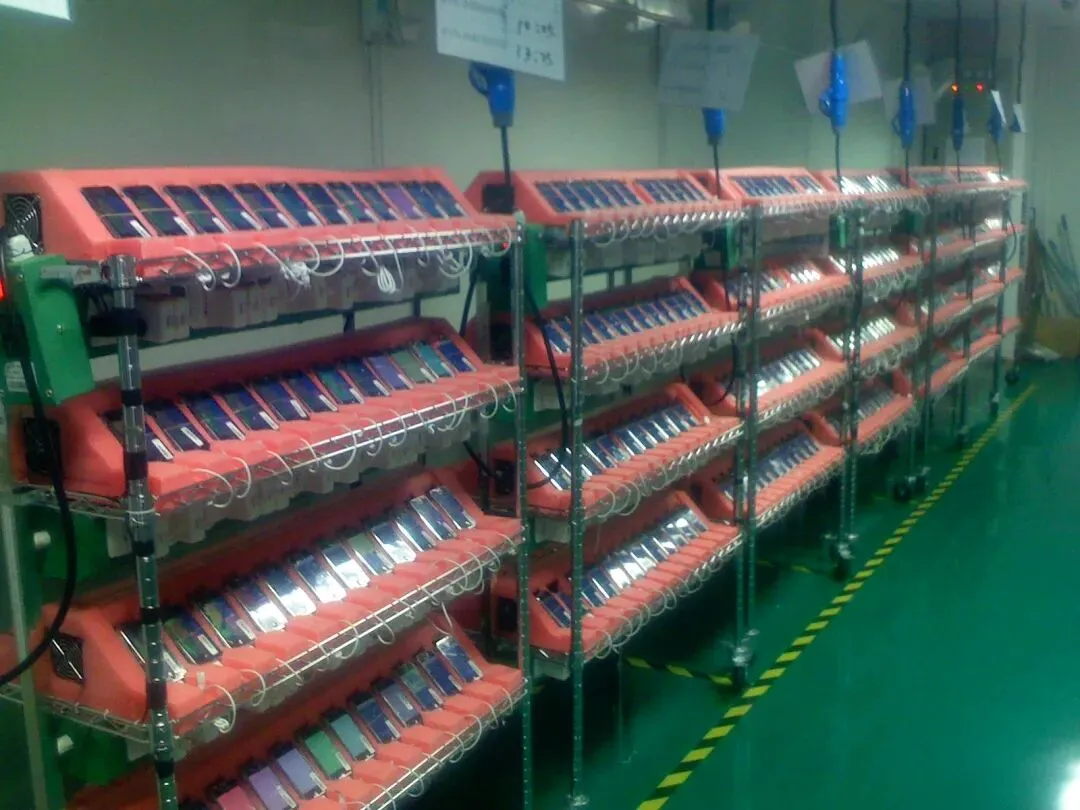地点似乎仍然是我们所熟悉的富士康,几百部iPhone排列在在大规模测试架上,每一部均有线缆连接,一张照片中的员工将单个iPhone连接到测试设备上进行最后检查,另一张上则是正在运行测试软件的iPhone。
