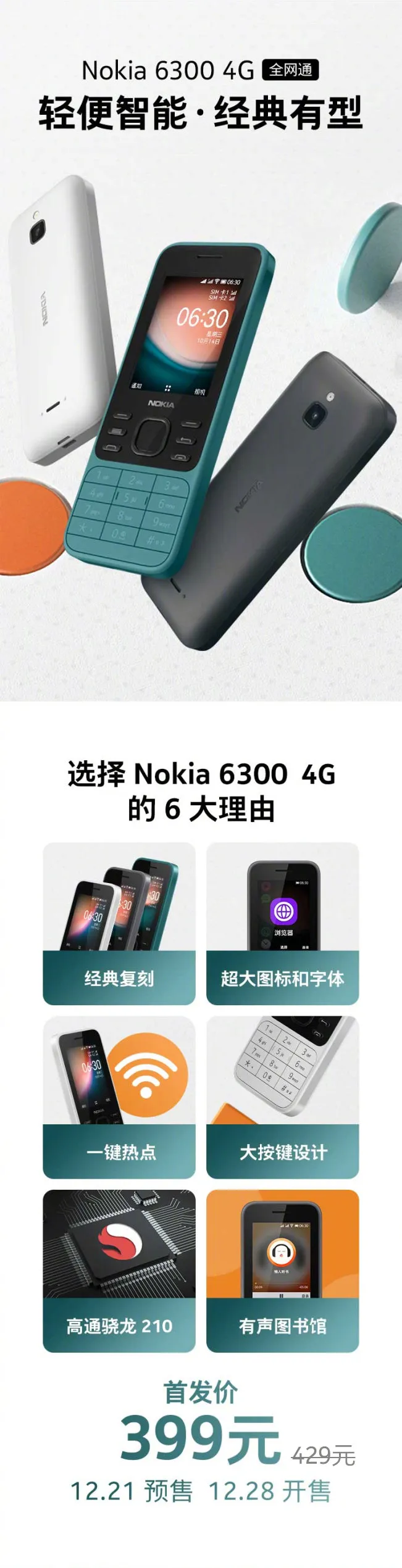 之前预热许久的诺基亚6300 4G今日正式发售,这是一部外观复刻2007年诺基亚6300的“功能机”,目前已上架诺基亚手机商城及合作电商平台,售价429元,提供黑色、白色、蓝绿色三种款式。