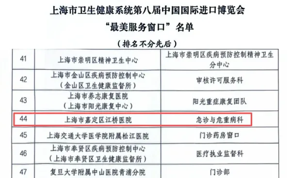 近日,上海市卫生健康系统精神文明建设委员会办公室印发《关于上海市卫生健康系统第八届中国国际进口博览会寻找“最美服务窗口”推选结果的通知》,嘉定区江桥医院急诊与危重病科团队获评上海市卫生健康系统第八届中国国际进口博览会“最美服务窗口”。