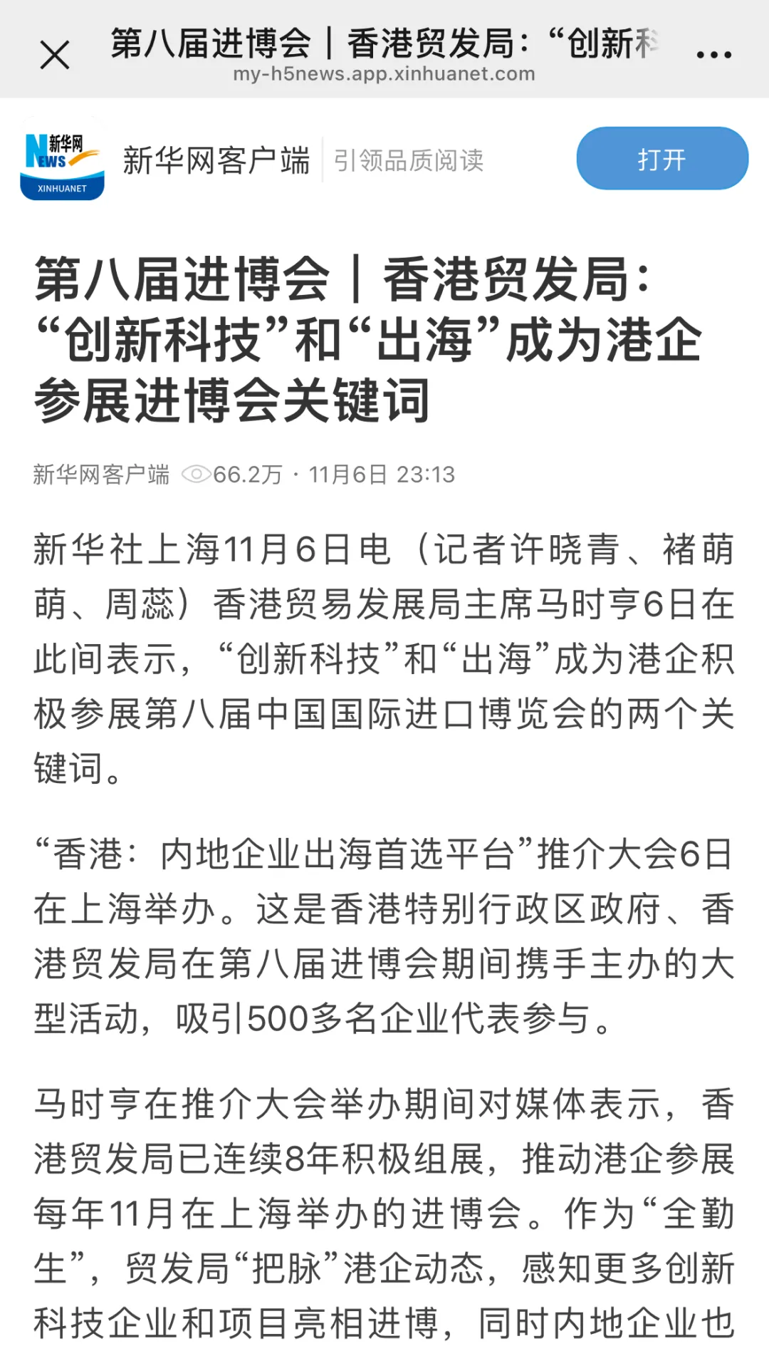 香港特别行政区政府与香港贸发局于进博会第二日(11月6日)在上海浦东携手主办「香港:内地企业出海首选平台」推介大会,作为特区政府新成立的「内地企业出海专班」首场内地大型宣传活动,成功凸显香港作为「超级联系人」及「超级增值人」的桥梁角色和功能,现场反应热烈,吸引500名来自创科、医疗及专业服务等领域的企业代表出席。