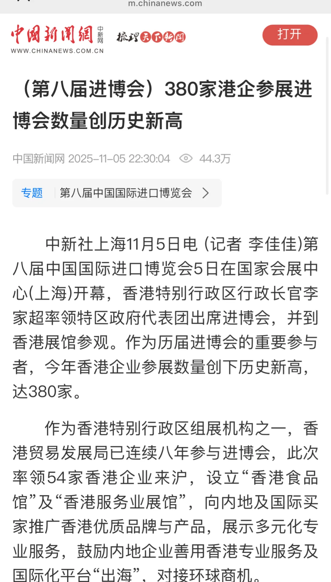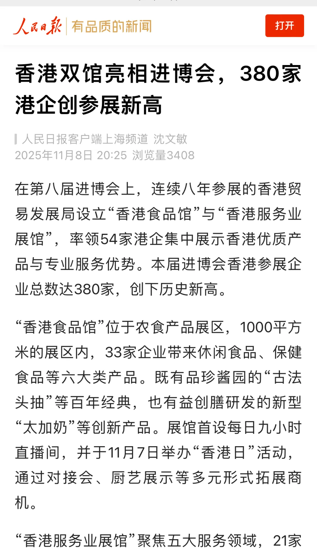 进博优品交易会(小进博)期间,《第八届中国国际进口博览会传播影响力报告》在国家会展中心(上海)发布。《报告》显示,第八届进博会传播影响力突出,全网信息量超过240万条,总曝光量超60亿次,同比增长20%。连续8年组织港商参展的香港贸发局入选第八届进博会传播影响力指数“十五佳展团”。香港贸发局亦于“小进博”期间设立展位,继续推广香港好物。