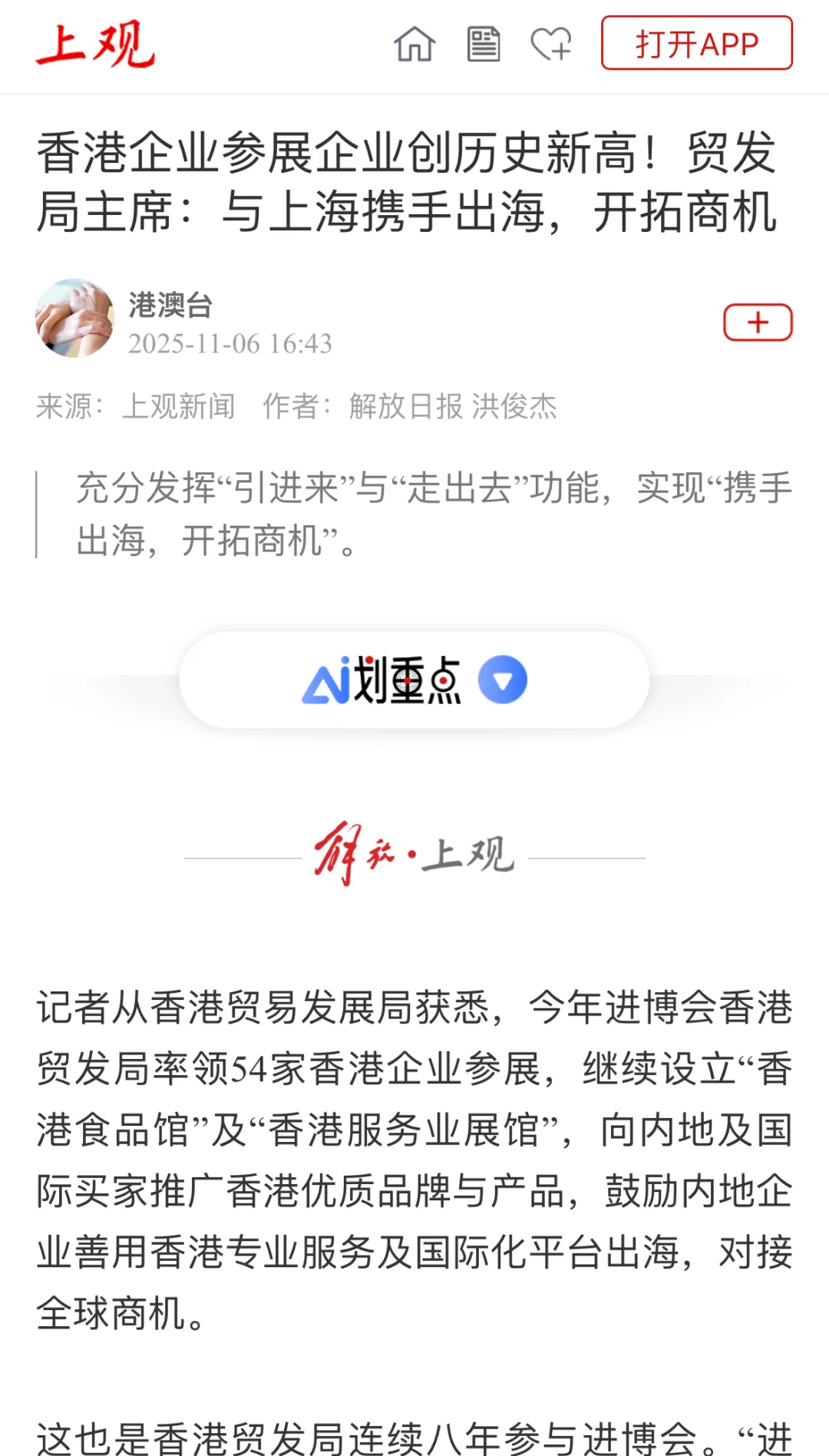 香港贸发局亦参加由进博会新闻中心组织的“全勤生与新朋友”媒体群访、“总裁面对面”群访,以及央视新品汇直播。