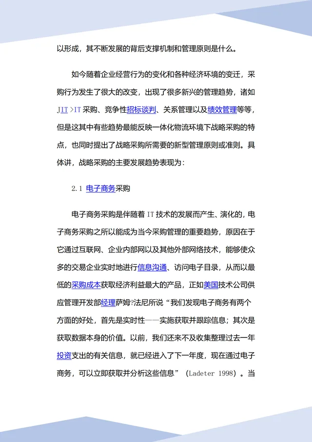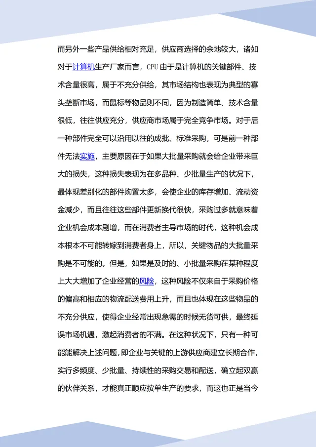 并且提出现代战略采购管理只有打破单一界面、站在企业整体最优和供应链最优基础上,实现供应细分管理才能真正为企业取得生存发展的空间。