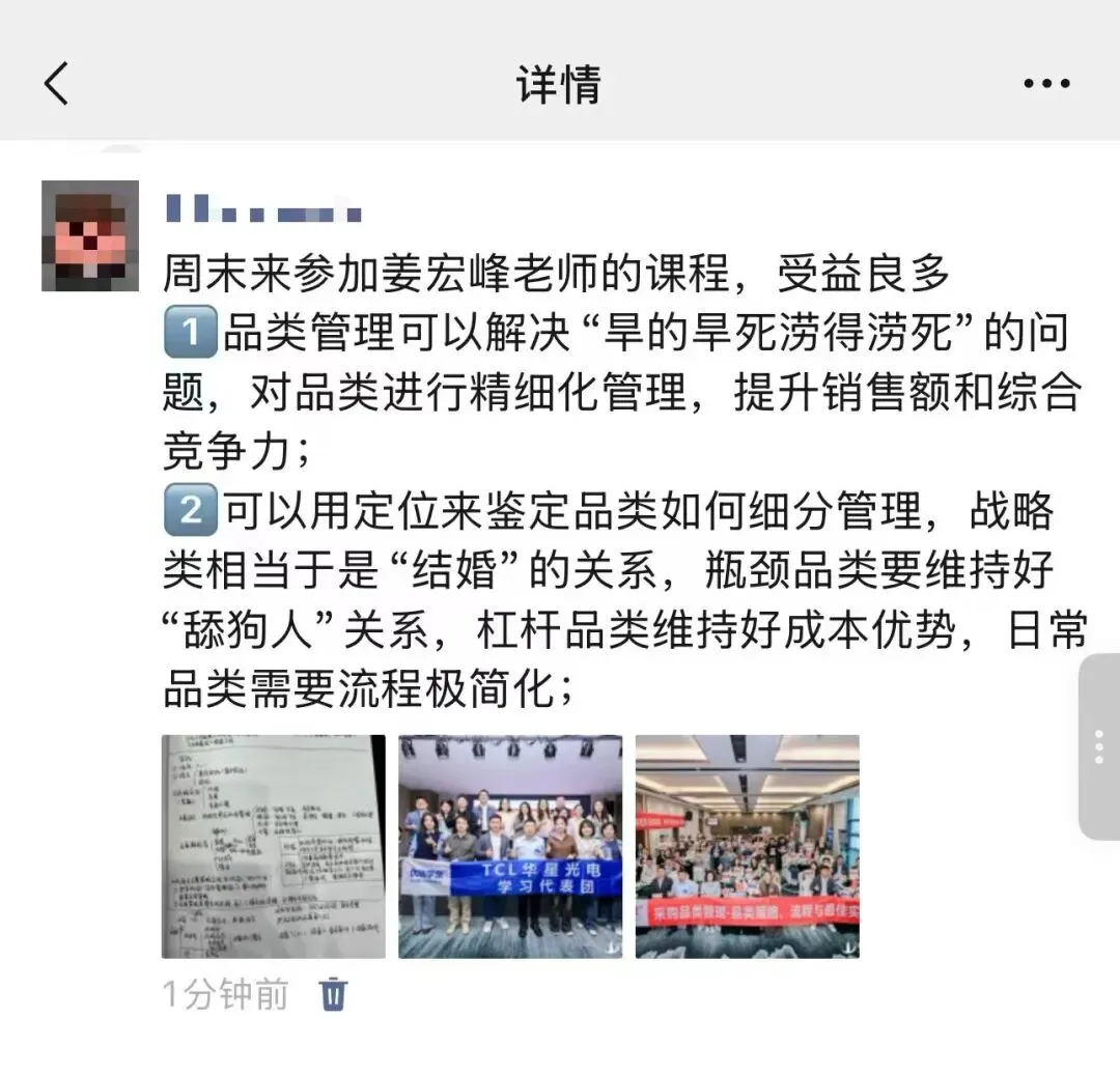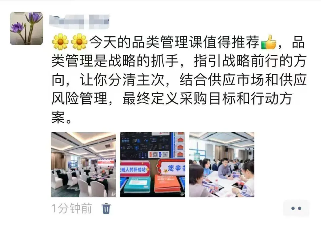姜老师通过持续不断地深入企业辅导,落地提炼出来一套行之有效的采购品类管理体系、策略和方法,辅导企业每年做品类报告、品类策略大赛、品类管理案例集,深度融入企业的组织基因中。不仅帮企业提升了采购团队的专业度,解决了跨部门的协同问题,更帮企业实现了精准降本增效的难题。