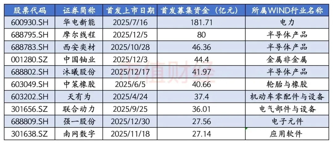 首先,2025年首发募资呈现出“大单云集”的特点。年内前十大IPO合计募资561.64亿元,占全年总额的44.82%。华电新能以181.71亿元的募资额位居首位,为年内募资规模最大的IPO,作为中国华电集团唯一的新能源业务整合平台,其资金精准投向风电与太阳能发电项目。