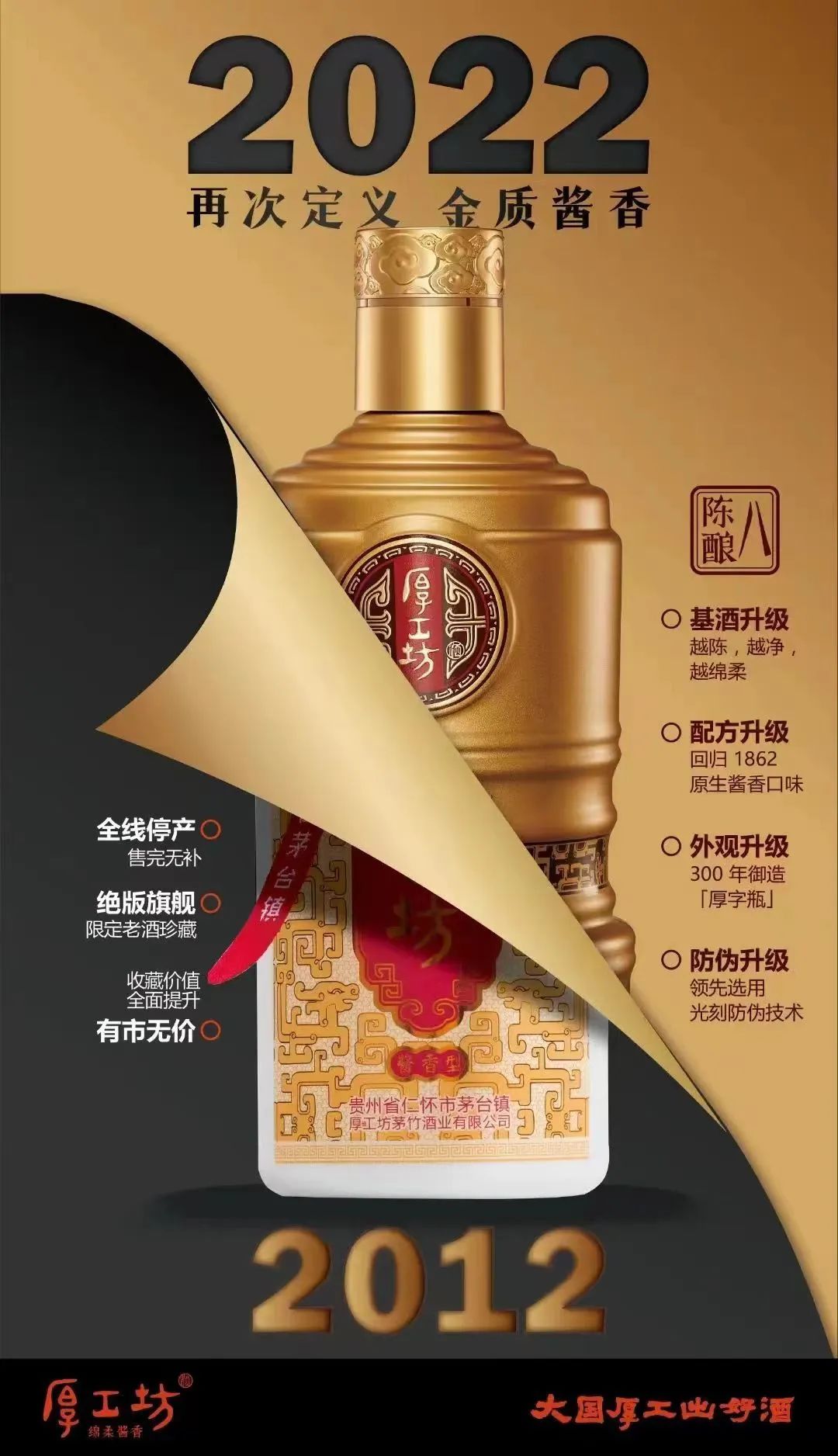 2012年,厚工坊凭借陈酿系列产品拿下世界食品品质评鉴会两项金奖及一项特别金奖,受到国内外酒业专家以及广大消费者的广泛认可,逐步在高端酱酒领域站稳脚跟。