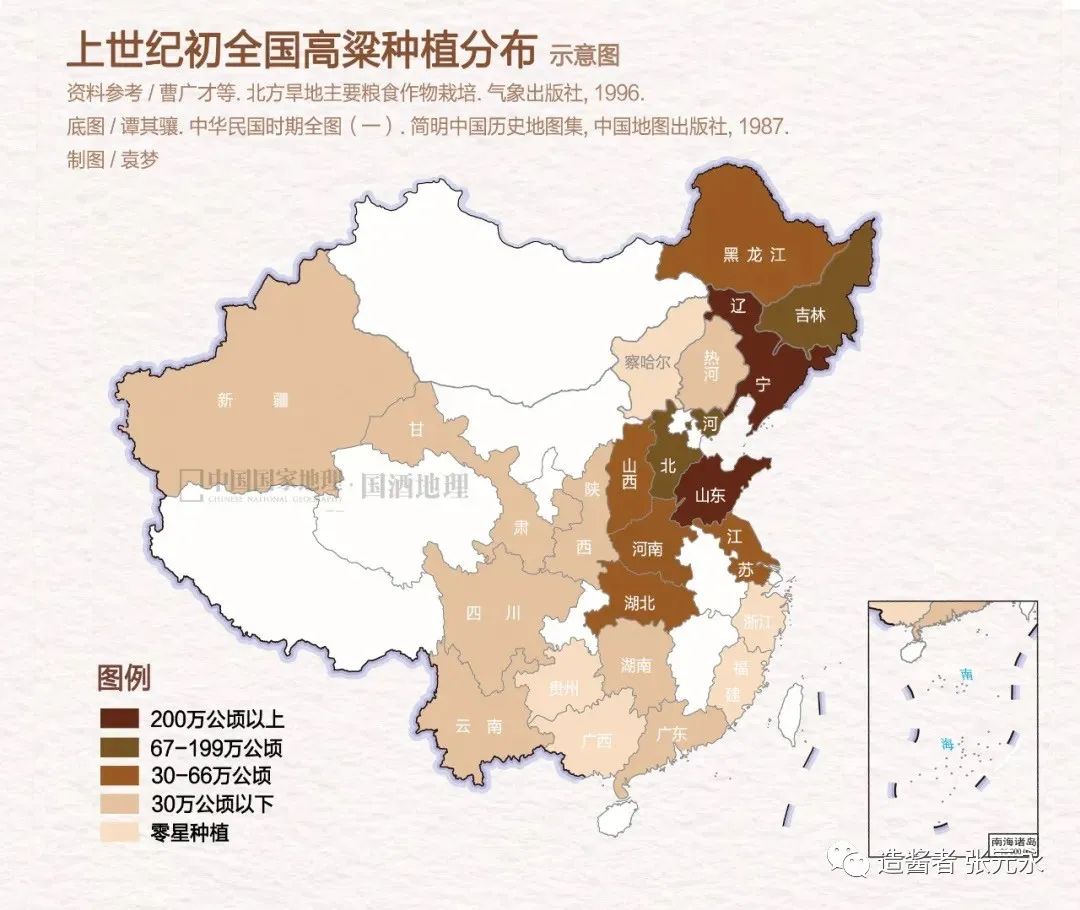 据统计,1918年是解放前中国高粱种植面积最大、总产量最高的一年,当年种植面积为1473.6万公顷,参照1927年全国832,520平方千米的耕地总面积推测(葛全胜等. 20世纪中国土地利用变化研究. 地理学报, vol.55(6). ),当时全国每六块耕地就有一块在种高粱。