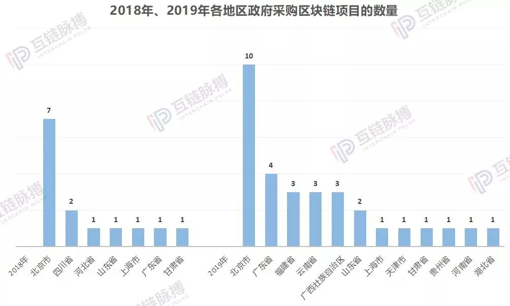 首先,从采购主体分布的地区来看,近两年,北京地区的政府部门是区块链项目的采购主力。此外,2018年时,四川省位列北京市之后,有2项区块链采购项目;而到了2019年,广东省、福建省、云南省、广西壮族自治区则有更突出的表现。