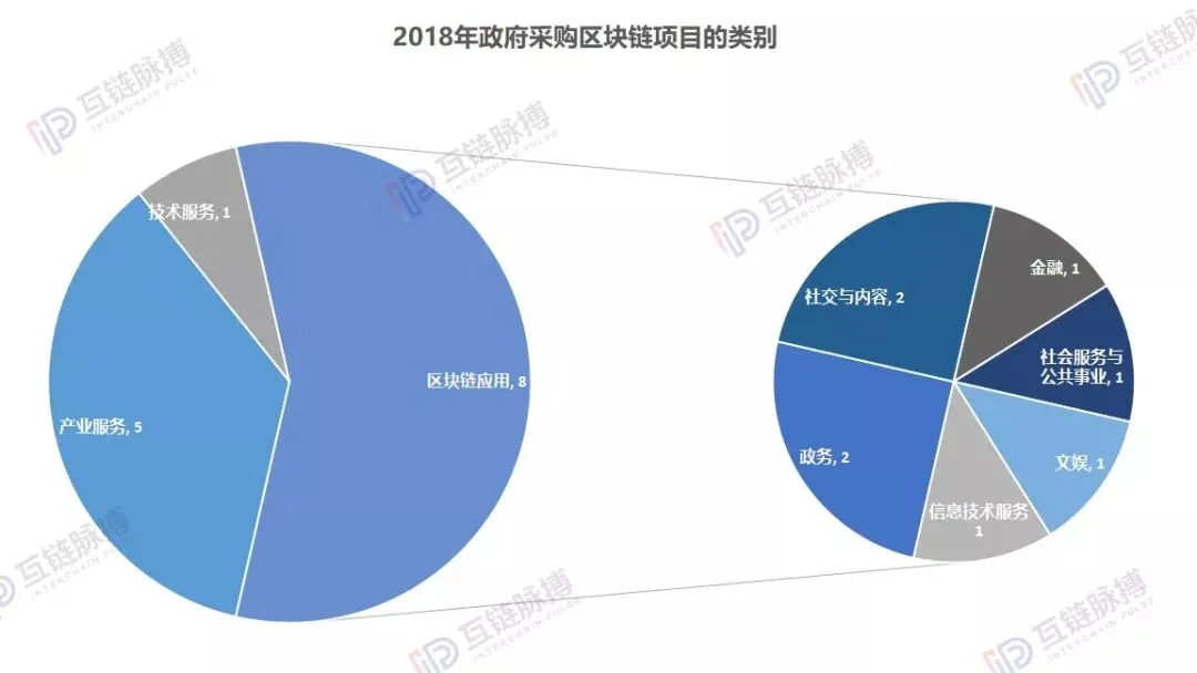 在上述机构、部门的积极行动下,诸多区块链采购项目被发起。互链脉搏按区块链分类体系将之划分。2018年,共有8项区块链应用类项目,5项产业服务类项目,1项目技术服务类项目。在区块链应用类别中,政务、社交与内容(产权)方面占据了一半比重。