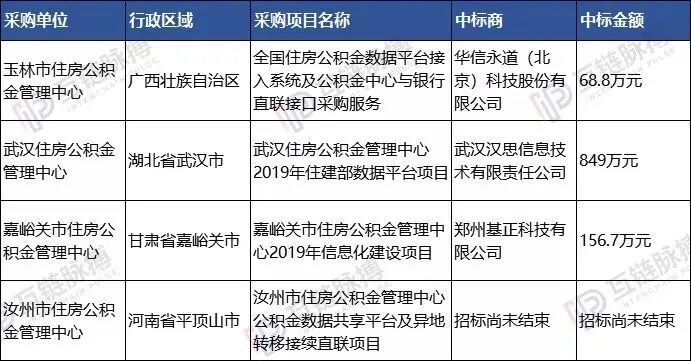 广西壮族自治区玉林市、湖北省武汉市、甘肃省嘉峪关市、河南省平顶山市多地均开展了围绕住房公积金的政务应用的招标。该类项目,多是旨在完成公积金平台与区块链平台的对接,进行数据传输、数据校验、运用区块链技术保障数据安全性和一致性。