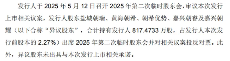 然而,在推进上市时,麦田能源却意外遭遇股东“叫板”。招股书显示,麦田能源于5月12日召开2025年第二次临时股东会,审议本次发行上市相关议案,股东盐城朝瑞、黄海朝希、朝希优势、嘉兴朝睿及嘉兴朝耀(以下合称“异议股东”)对相关议案投反对票。此外,异议股东未出具与本次发行上市相关承诺。