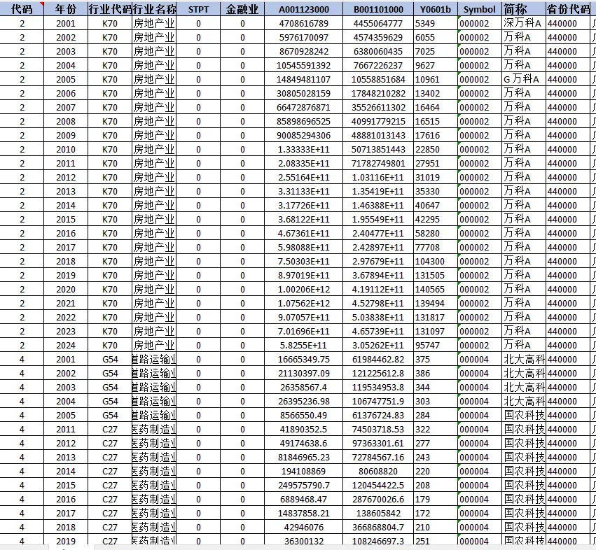 代码 年份 行业代码 行业名称 STPT 金融业 A001123000 B001101000 Y0601b Symbol 简称 省份代码 省份 城市代码 城市 labprod1 labprod2