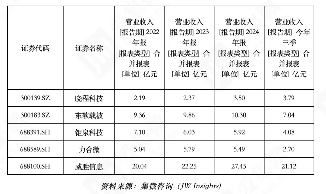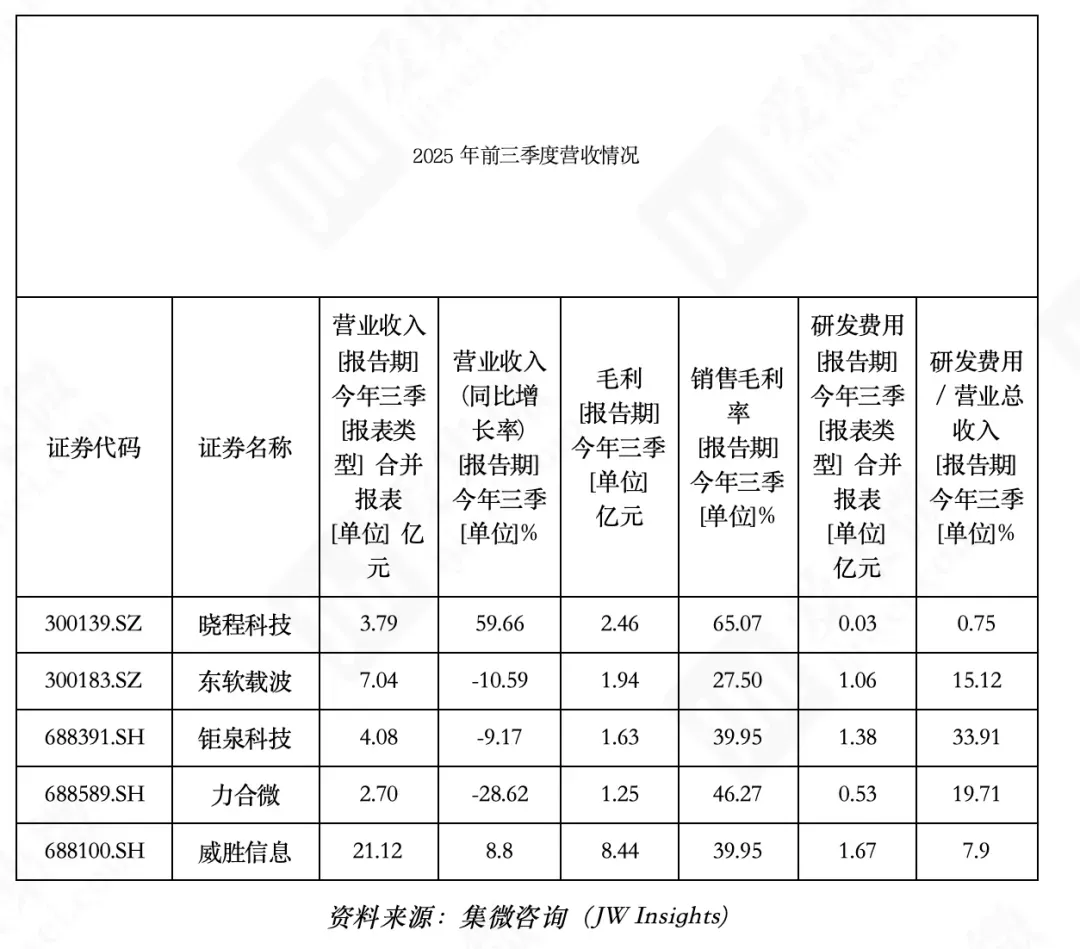 2025前三季度营业总收入从高到低分别为威胜信息(21.12亿元)、东软载波(7.04 亿元)、钜泉科技(4.08 亿元)、晓程科技(3.79 亿元)、力合微(2.70 亿元)。