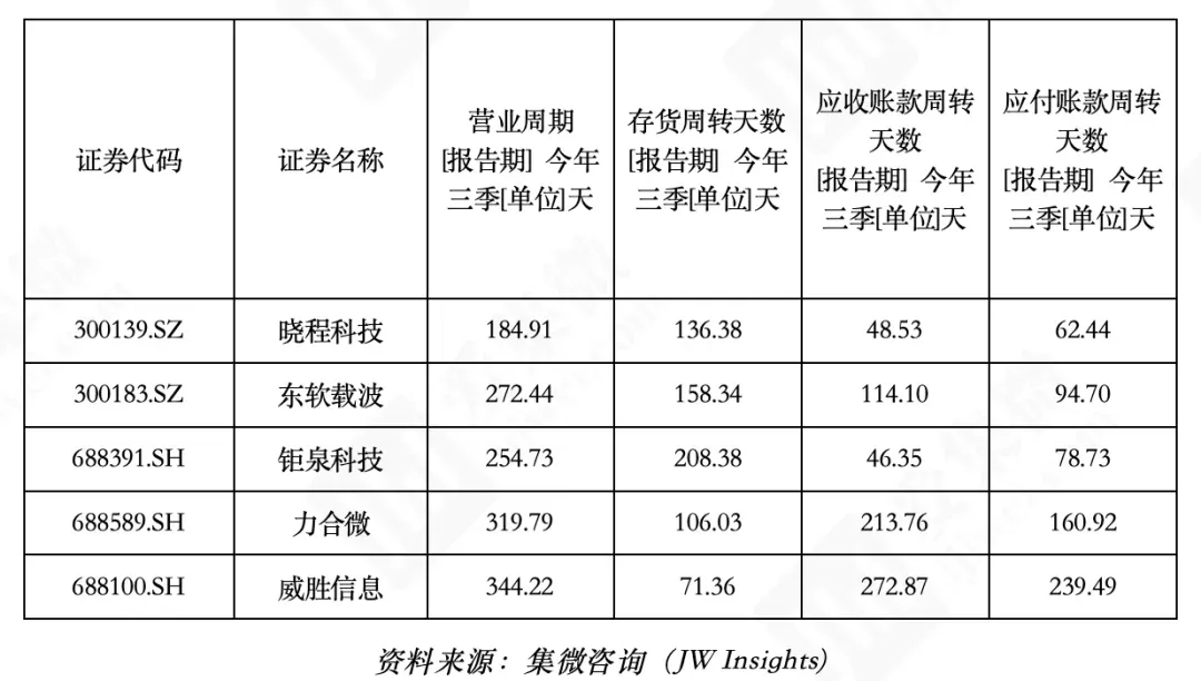 营业周期天数最长为威胜信息(344.22 天),最短为晓程科技(184.91 天)。
