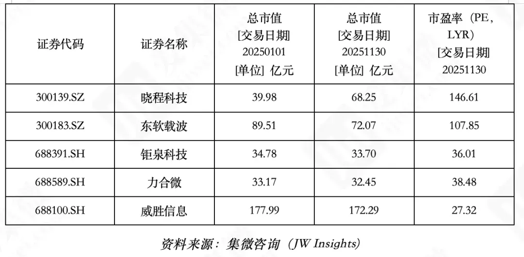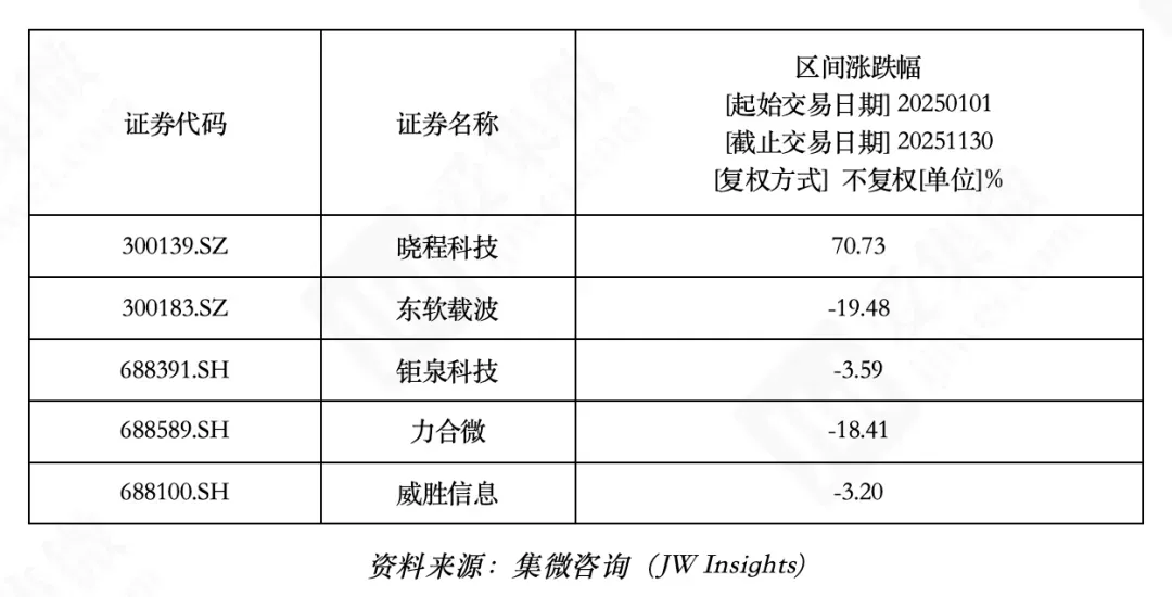 截至 2025 年 11 月 30 日,区间涨幅最高的公司是晓程科技(70.73%),涨幅最低的公司是东软载波(-19.48%);市值最高的公司是威胜信息(172.29 亿元),市盈率最高的公司是晓程科技(146.61)。此外,该报告从产品布局、市场地位与技术特色等多个维度,对无线通信芯片赛道的海外龙头企业德州仪器、意法半导体及大陆未上市企业进行了系统解读。