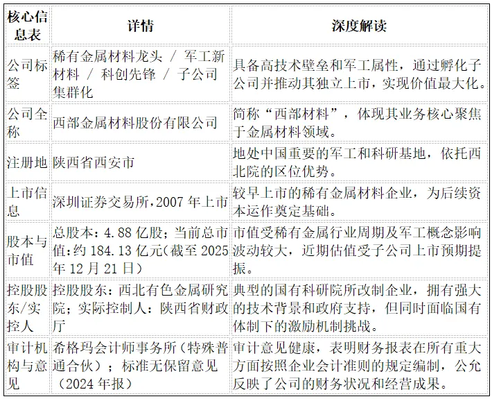 西部材料是一家依托国家级科研院所(西北院)的稀有金属新材料平台型企业,其核心价值在于将高壁垒的钛合金、复合材料等科研成果产业化,并通过推动旗下子公司独立上市,形成“1+N”的资本集群,开启价值重估周期;但需警惕其短期业绩波动、应收账款高企带来的回款压力和现金流风险。
