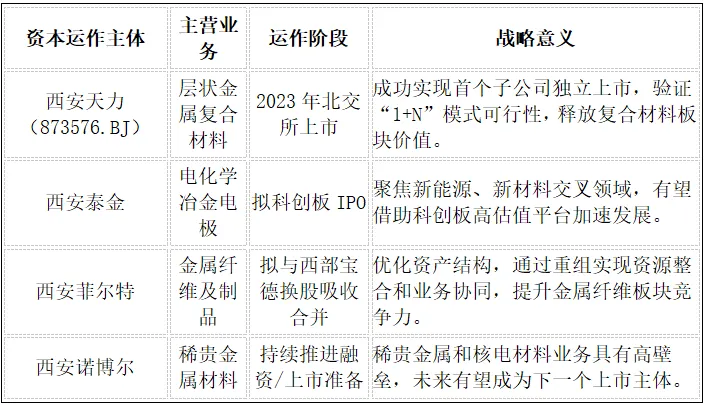 战略成败的关键点在于“1+N”的平台化战略。 过去的资本运作,如孵化西安天力并成功上市,是创造价值的典范。它不仅为母公司带来了投资收益,更重要的是,它为整个产业集群注入了市场活力和独立融资能力。这种模式的成功,使得西部材料不再仅仅是一家材料加工企业,而是一个新材料产业生态的构建者。