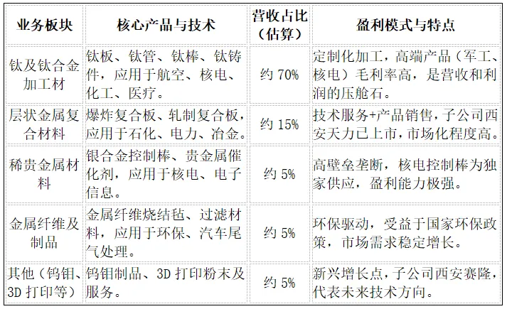 公司以钛及钛合金为核心,同时发展层状金属复合材料、稀贵金属材料、金属纤维及制品等多元化新材料业务。公司产品技术含量高,主要服务于航空航天、核能、深海、化工等对材料性能要求极高的领域,是国家新材料战略布局中的重要一环。
