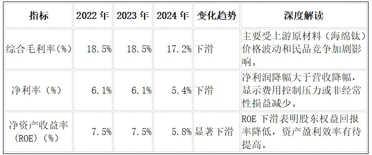 深度分析: 公司的盈利能力指标在2024年普遍出现下滑。毛利率的下降是最大的警示信号,这直接关系到公司的核心竞争力。虽然公司的高端产品具有高溢价,但如果原材料成本上涨的压力无法有效向下游传导,或者民品业务的占比过高,都将持续侵蚀整体毛利率。