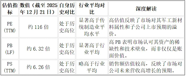 深度分析: 尽管公司身处高景气度的新材料赛道,但近两年(2023-2024)的营收和净利润复合增长率均为负值,表明公司在短期内面临较大的经营压力。这主要归因于:一是民用市场(如化工、冶金)需求疲软,价格竞争激烈;二是高端产品(军工、核电)订单交付节奏波动,导致业绩短期内难以持续高增长。