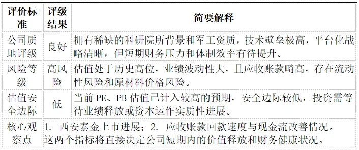 然而,当前公司面临的挑战不容忽视。高达116倍的PE(TTM)和6.32倍的PB,表明其估值已充分反映了市场对其未来增长的乐观预期。同时,2024年业绩的下滑和2025年一季度应收账款的持续高企,构成了显著的短期财务风险。因此,我们给予其“良好”的质地评级,但同时给出“高风险”和“低安全边际”的警示。
