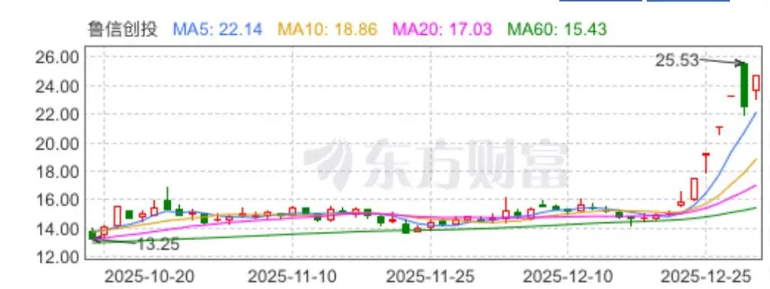 数据显示,自12月24日起,鲁信创投股价开启快速拉升模式,6个交易日内斩获5个涨停板,累计涨幅高达56.03%,累计换手率达41.64%。截至12月31日A股收官,公司股价收报24.73元每股,当日再度以10.01%的涨幅封死涨停。