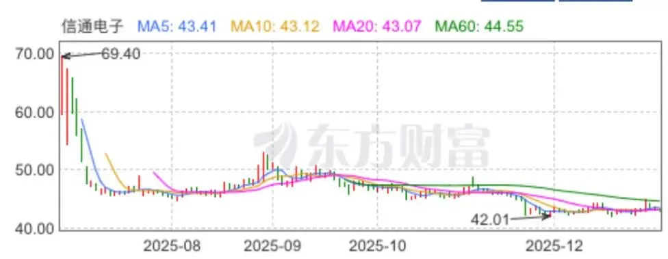 半年过去后,信通电子股价进入持续调整阶段,近三个月在50元之下游走,11月28日产生2025年最低价42.01元。