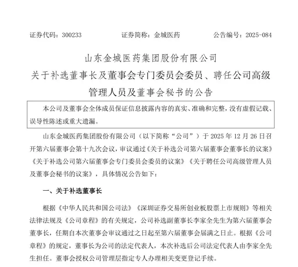 值得关注的是,金城医药(300233)原董事长赵叶青因操纵证券市场,被证监会处以150万元罚款及4年市场禁入。在其辞职后,金城医药也于12月26日召开董事会完成人事补位,补选副董事长李家全为第六届董事会董事长,聘任杨新喆为副总裁兼董事会秘书。