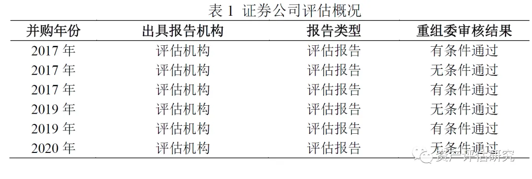 我们共搜集到6份有效的样本案例,通过统计分析报告的基本特征发现,样本中承做证券公司价值评估工作的机构均为资产评估机构,无资产评估机构之外的其他类型的机构;出具报告的类型均为资产评估报告,无估值报告;6份并购重组案例均通过了重组委审核。