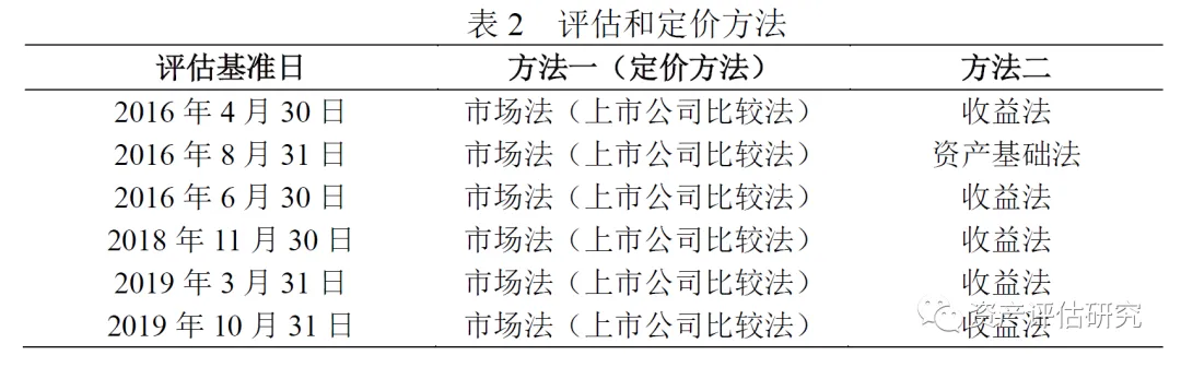 从样本案例报告选择的具体评估方法来看,样本报告均选择了市场法中的上市公司比较法作为其中一种评估方法。另外,有5份样本报告选择以收益法作为另外一种评估方法,仅有1份样本报告选择了资产基础法作为第二种评估方法。而且,所有样本报告均选择了市场法——上市公司比较法作为定价方法。