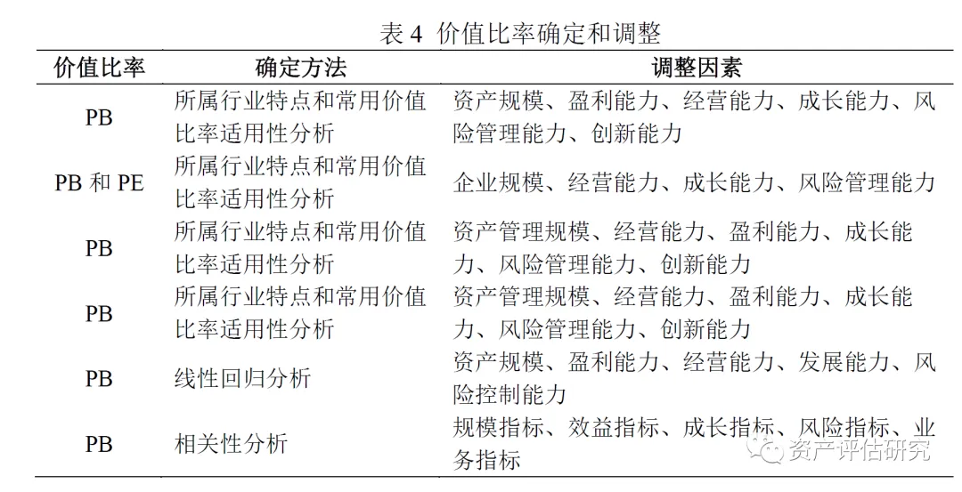 我们发现该报告中评估人员分析认为证券行业是一个周期性行业,其PE的波动幅度较为明显;同时从证券公司的经营特点看,其利润主要来自于规模(包括资金规模、业务规模等),因此净资产指标对于证券公司的企业价值较为重要。另外,考虑到证券公司的规模一般都超过10亿元,其净资产波动幅度也相对较小,因此目前资本市场并购案中往往采用PB对证券公司的企业价值进行估值。综合考虑了上述多方面因素,该报告最后也选择了PB作为唯一的价值比率。即6份样本报告最终都选择了PB作为价值比率。