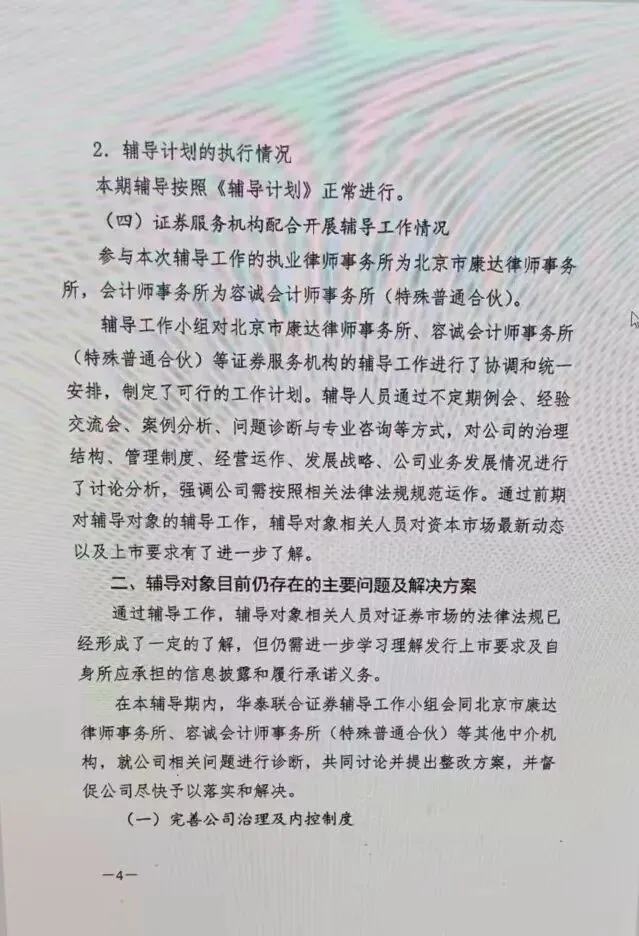 华泰联合证券上述报告的第一大部分《辅导工作开展情况》《辅导内容》(5)是《协助公司完成上海证券交易所申报前咨询沟通工作》,具体内容是:"本辅导期内,辅导机构协助公司在业务合规性方面取得积极进展。对业务合规性事宜,辅导机构协同公司开展充分论证与分析工作,拟定并提交上海证券交易所申报前咨询沟通函。辅导机构协同公司围绕业务合规性相关事项在上海证券交易所现场完成申报前咨询沟通。"
