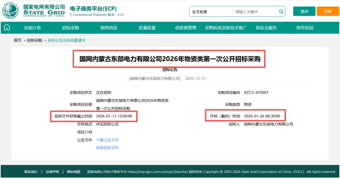 招标文件(电子文件)免费获取。凡有意参加投标者,请于2025年12月31日-2026年1月13日12:00时(北京时间,下同),登录招标人招投标交易平台信息系统(国家电网有限公司电子商务平台https://ecp.sgcc.com.cn,以下简称电子商务平台)获取招标文件,并按《电子招标投标办法》等国家法律法规要求,到第三方认证机构办理CA证书电子钥匙。投标人应妥善保管招标人招投标交易平台信息系统账号和密码,以及CA数字证书和密码,因上述账号、数字证书或密码保管不当造成的损失,由投标人自行承担。