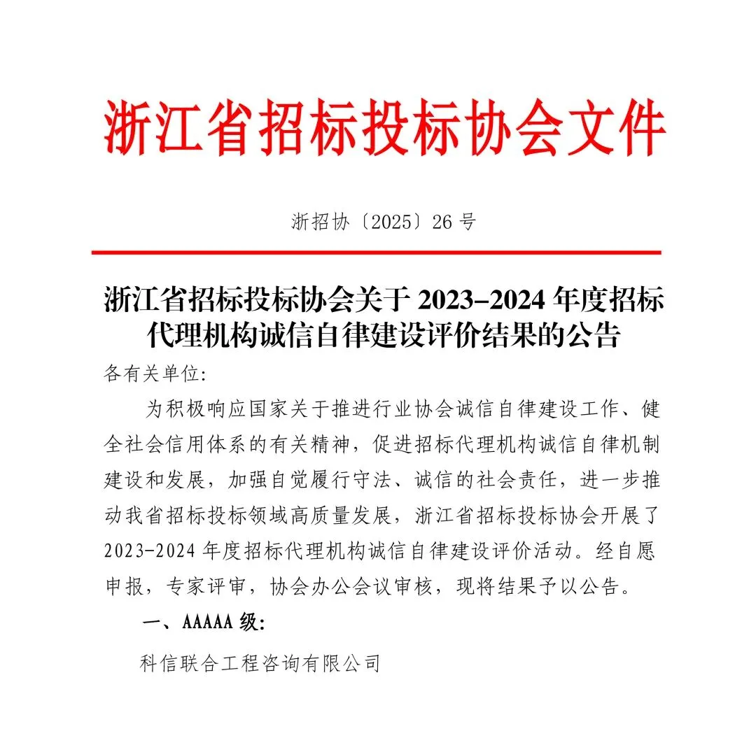 近日,浙江省招标投标协会公布2023-2024年度招标代理机构诚信自律建设评价结果,公司凭借规范的执业行为与深厚的诚信积淀,荣获浙江省招标投标协会2023-2024年度招标代理机构诚信自律建设AAAAA级(最高级)殊荣,充分彰显了公司在招标代理领域的公信力与品牌影响力。