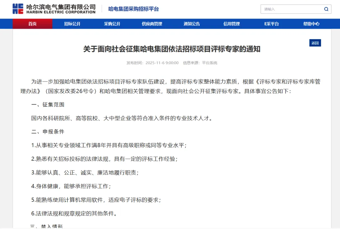 哈尔滨电气集团电子商务平台依法招标项目评标专家